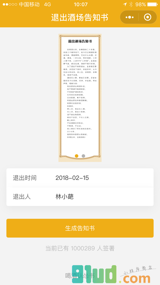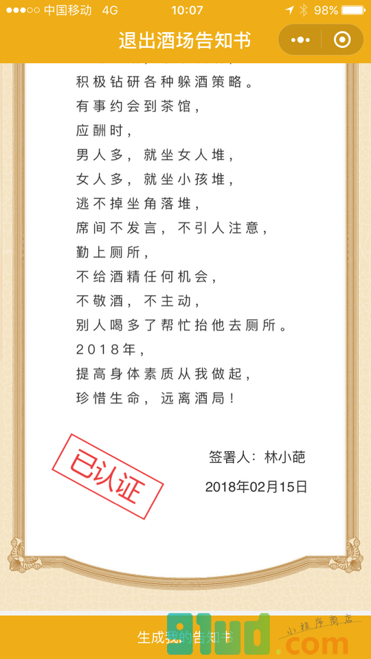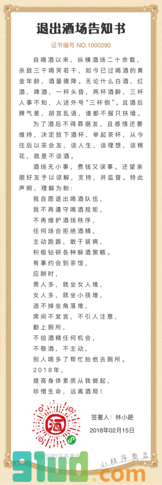 退出酒场告知书:我志愿退出喝酒队伍,不再遵守喝酒规矩,主动跑路敢于装病,积极钻研各种躲酒策略,珍惜生命,远离酒局!