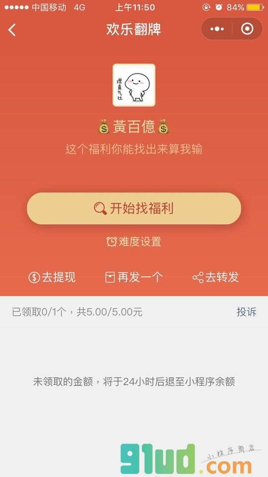 简介: 活跃气氛、休闲娱乐、好友翻牌PK奖励的小程序。 发起一个带奖励的翻牌红包,好友需要参与翻牌PK。 系统会评定翻牌是否成功,翻牌成功即可马上领取奖励! 抢到赏金可以马上提现,还是秒到帐哦~#翻牌红包#