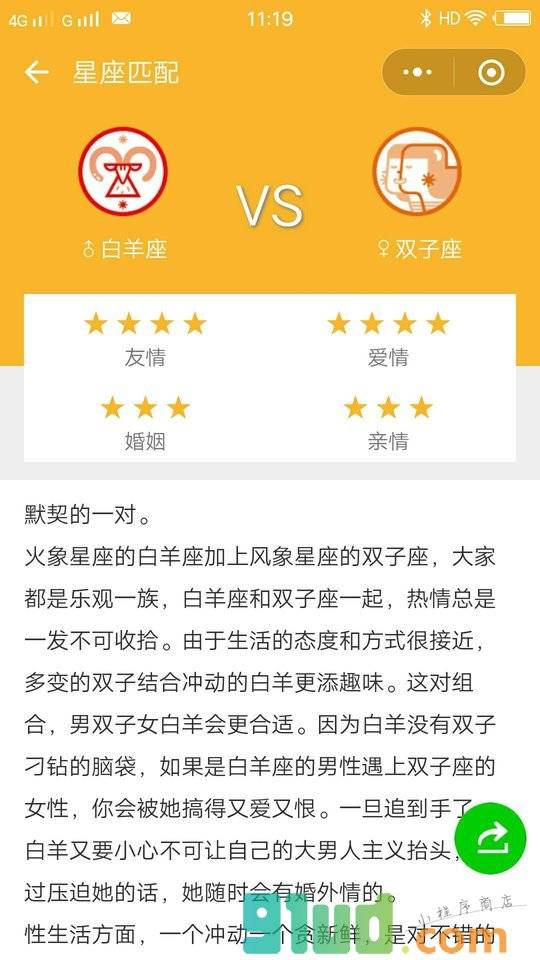 实用又好玩的星座查询工具,可方便查询十二星座信息,星座的运势,星座之间的匹配情况。用户可绑定自己的星座进行快速查询,并可进行好友间匹配互动,可通过转发好友或者生成海报的形式进行好友间匹配,用户可查看不同星座好友人数和匹配排行等结果。