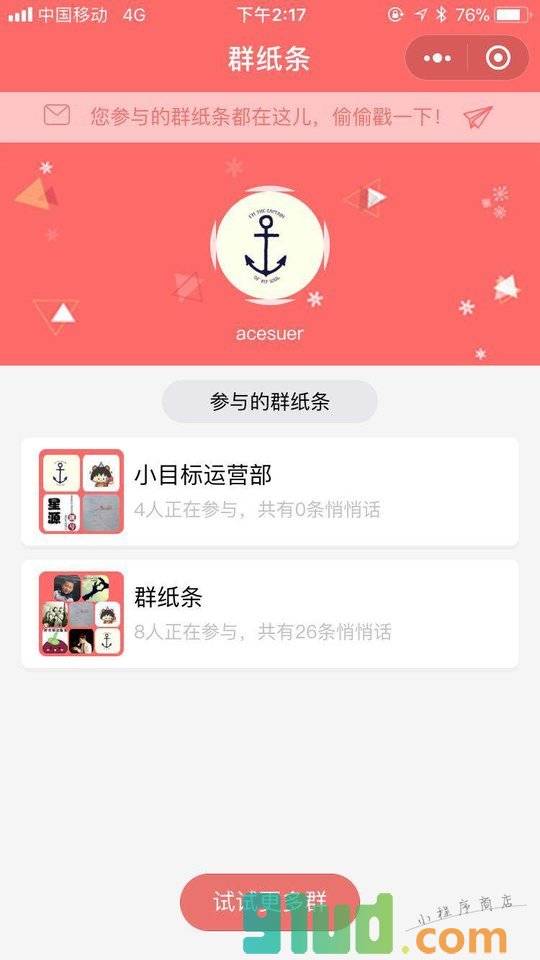 - 在微信中搜索“2177游戏”进入小程序后,搜索群纸条就可以找到。