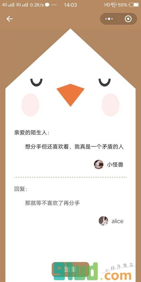 - 在微信中搜索“解忧杂货店收件箱”即可进入小程序