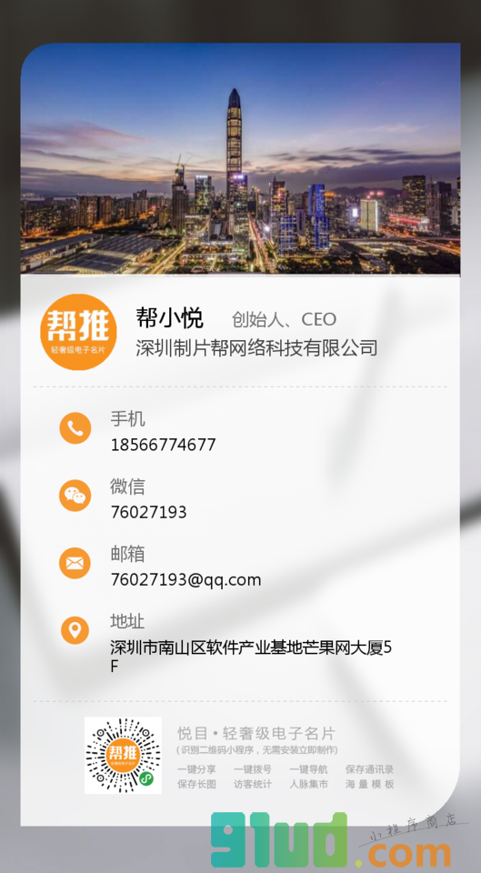 帮推· 轻奢级电子名片,专注于电子名片设计的研发与运营,产品具备一键分享、一键拨号,一键导航、通讯录保存、生成长图、访客统计、音乐播放、视频上传等功能;属制片帮旗下产品。 制片帮专注于企业智能营销工具的研发与运营,已推出帮推名片、制片帮APP、51vimeo.com视频制作服务平台、PHOTOTV可享拍即时摄影平台等多款具有行业影响力的产品,已获数百万用户认可。 仅希望通过我们的努力,为您的品牌插上腾飞的羽翼!