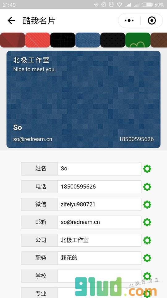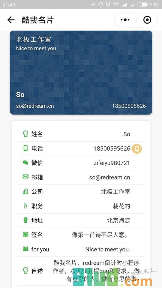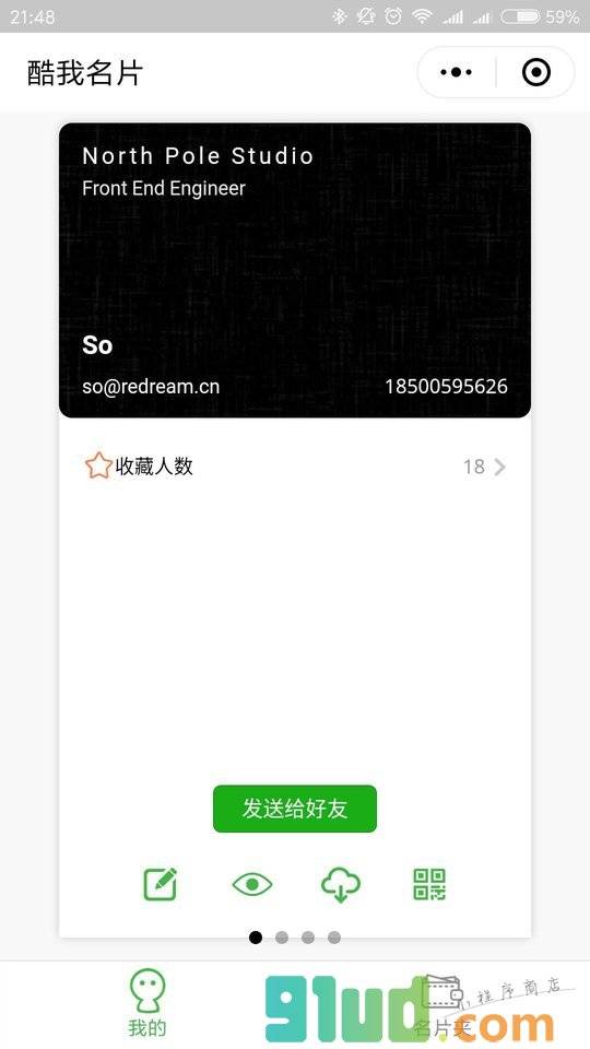 一款精美的名片工具,支持单用户多名片,满足社交多角色无缝切换。支持多种名片主题,商务、青春、个性均可满足,支持自定义字段,可随意添加显示内容。支持扩展属性,支持拨打电话、保存通讯录、保存为图片、下载个人二维码等高级功能。