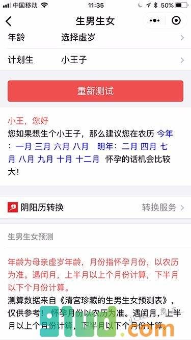 生男生女预测及月份计算依据《清宫珍藏的生男生女预测表》公式,数据仅供参考。
