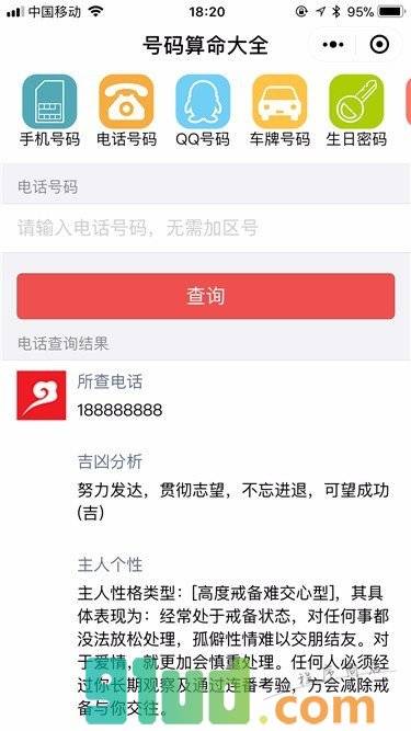 - 使用微信扫描页面上方二维码进入号码吉凶查询