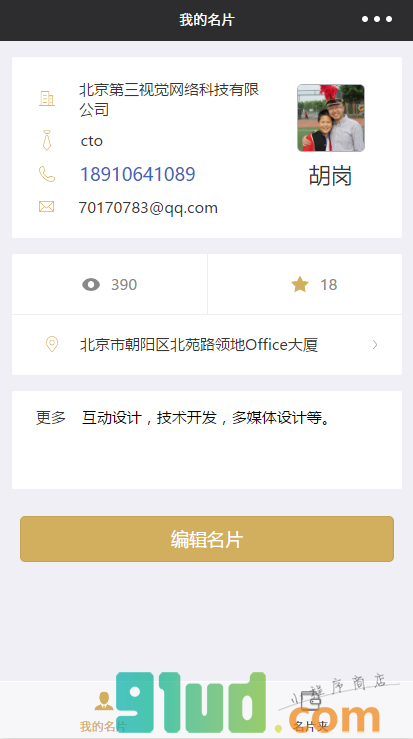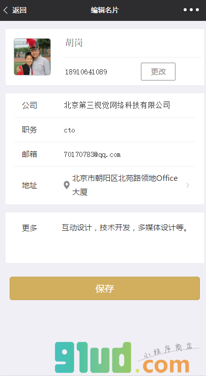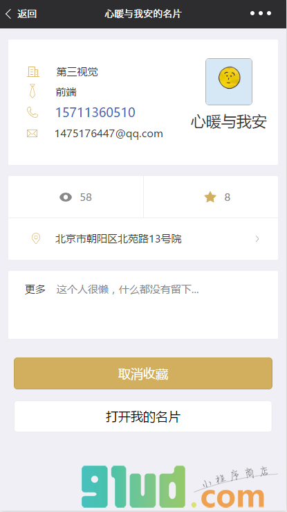 个人电子名片,可以分享,可以收藏。名片内容包括姓名,联系方式,公司名称,公司地址等。地址有地图标注,可调取地图app导航。