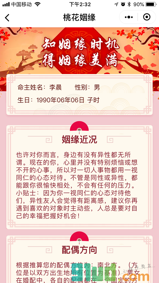 桃花姻缘是一款测算您的桃花运势的小工具。 它可以根据您的生辰八字,帮你预测您的桃花运势,配偶方向、另一半情况等等。 让您在恋爱路上少走弯路,尽早遇到理想的另一半。 此工具所有的测算结果来自专业命理大师所整理的测算数据。