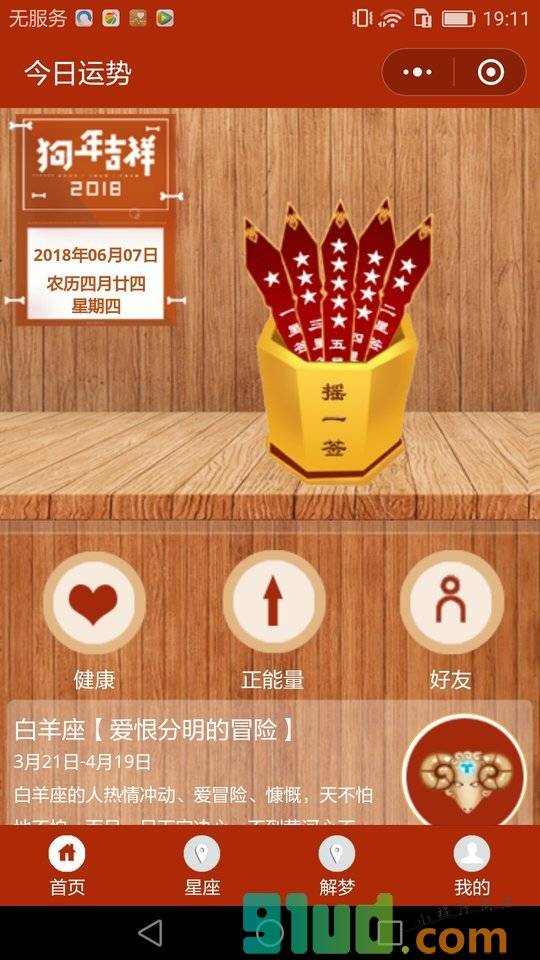 摇一签小程序是一款以大数据为依据,暗能量为导向,通过摇签的方式测出今日运势,并具有星座,运势,解梦,记步等功能,从全方面来衡量您当前运势。 摇一签提倡三要素,健康,正能量,好友,通过这三要素,可改变自己的运势! 1.健康,健康板块中小程序提供了记步功能,宣传全民健身 ,发起日行万步,健康伴随的口号。 2.正能量,正能量板块中小程序会提供具有正能量的图片,正能量语言 3.好友,好友板块中小程序提供星座匹配功能,进行好友打分,让你知道在星座方向上那个好友是和你最匹配的