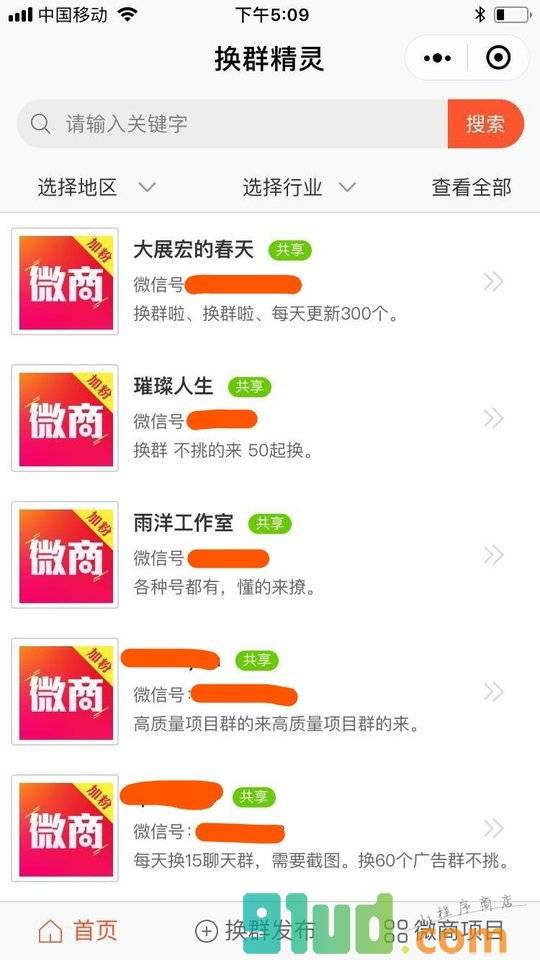 微商必备工具,让换群更容易、更简单,同时可以发布自己的微商项目。进入后会看到很多和你一样想换群的人发布的换群信息,里面有对方的联系方式,添加对方后,彼此就可以交换群资源了,你找到50个有换群需求的人,你就可以加入50个群,我们按一个群100人算,就是5000人,也就是说你的推广信息可以直达5000个用户。