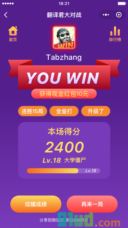 翻译君斗词儿微信小游戏由翻译君斗词儿团队开发,并于2018-06-22 14:28:35发布于小程序游戏盒子 2177.cn