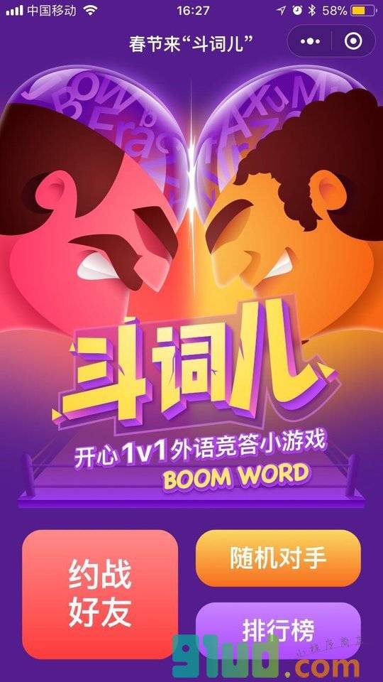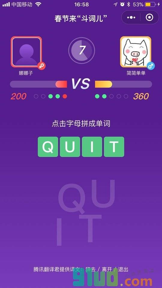 “斗词儿”是全球首款1V1趣味英语竞答小游戏,由腾讯翻译君团队开发。可选择“好友对战”或“随机匹配”模式,每局对战包含字母拼单词和趣味外语问答。2018年春节全新上线,换个新方式来拜年吧~