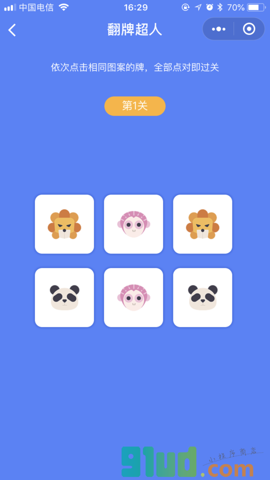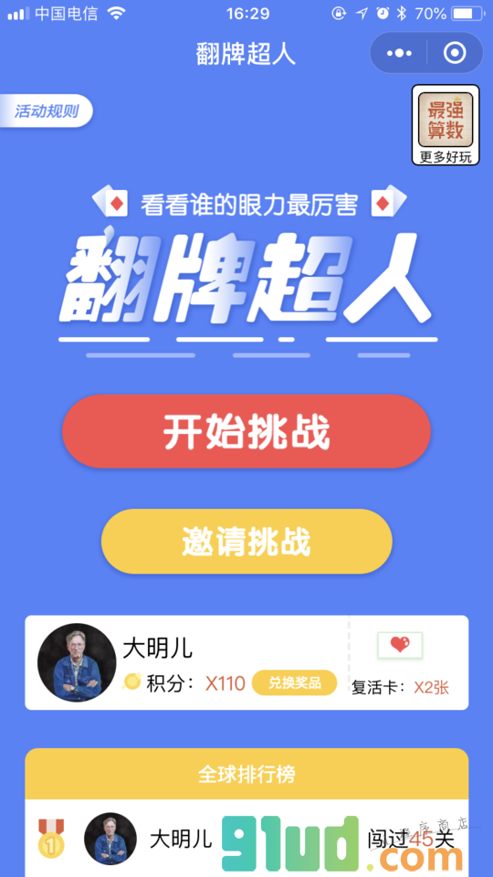 翻牌超人小程序:1.记忆翻牌,过关次数越多,得分越高 2.游戏结束随机获取积分 3.闯关失败可以使用复活卡复活 4.可以邀请好友为自己续命