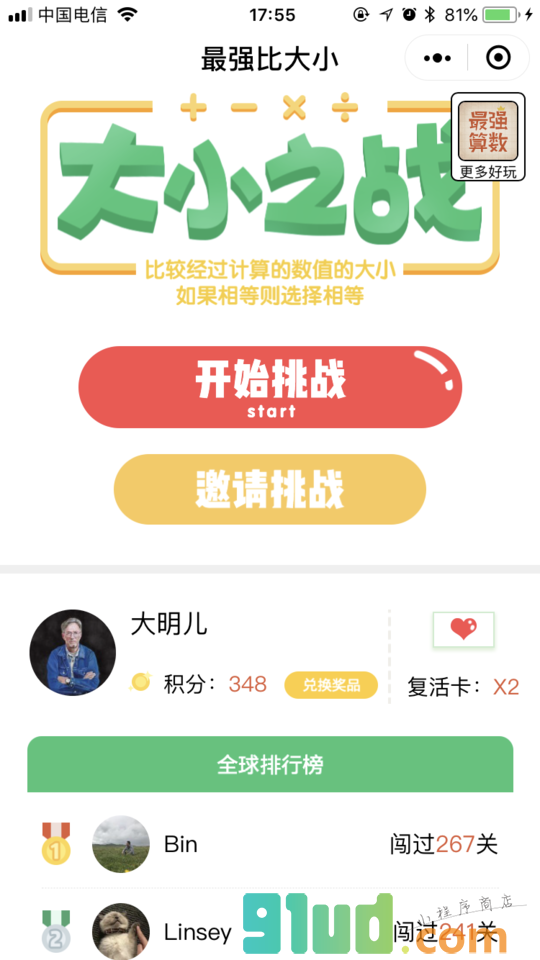 大小之战微信小游戏由大小之战团队开发,并于2018-06-22 14:29:07发布于小程序游戏盒子 2177.cn