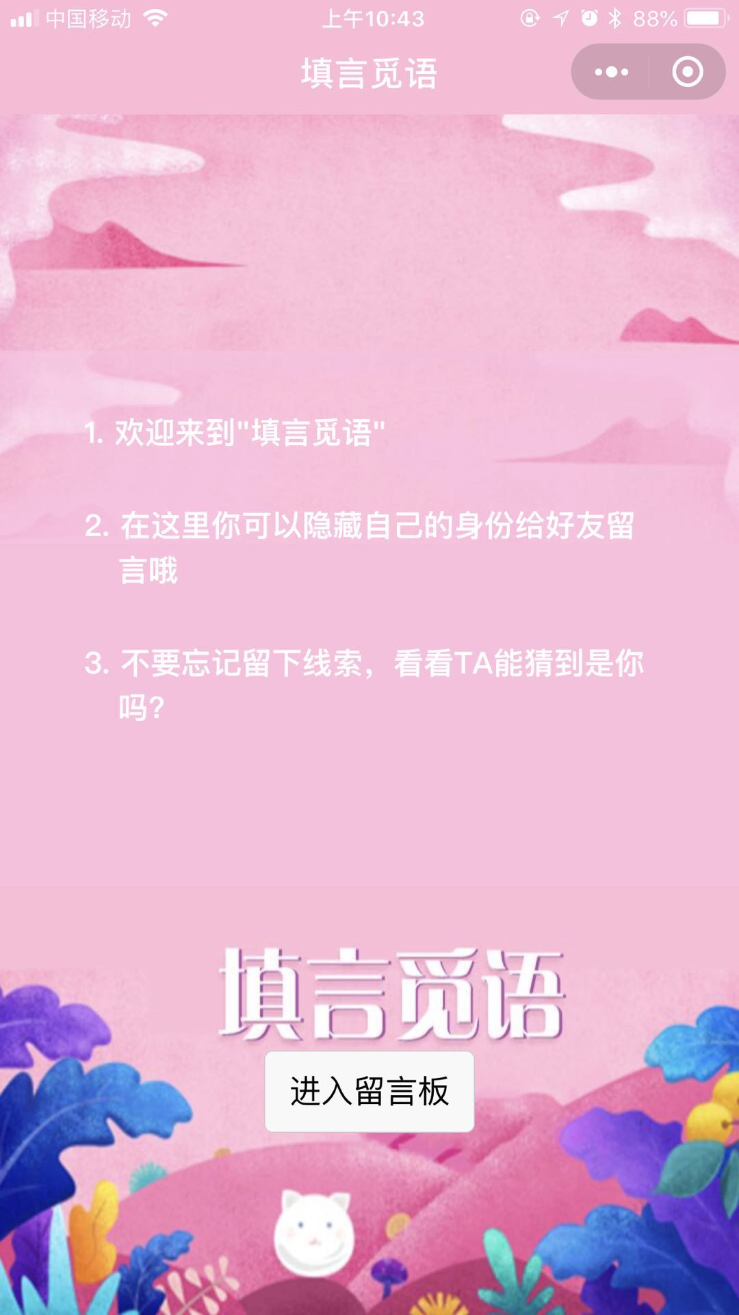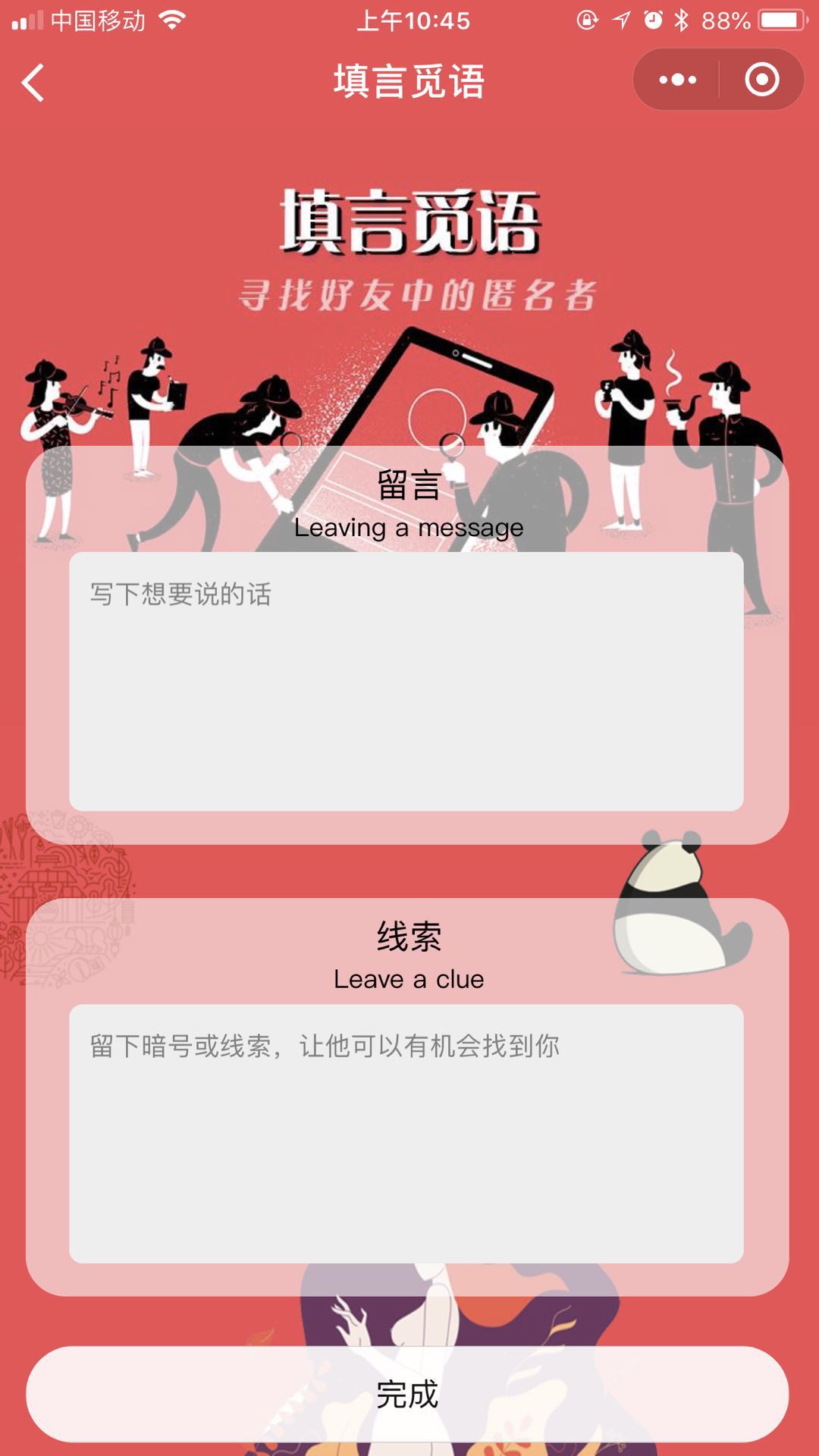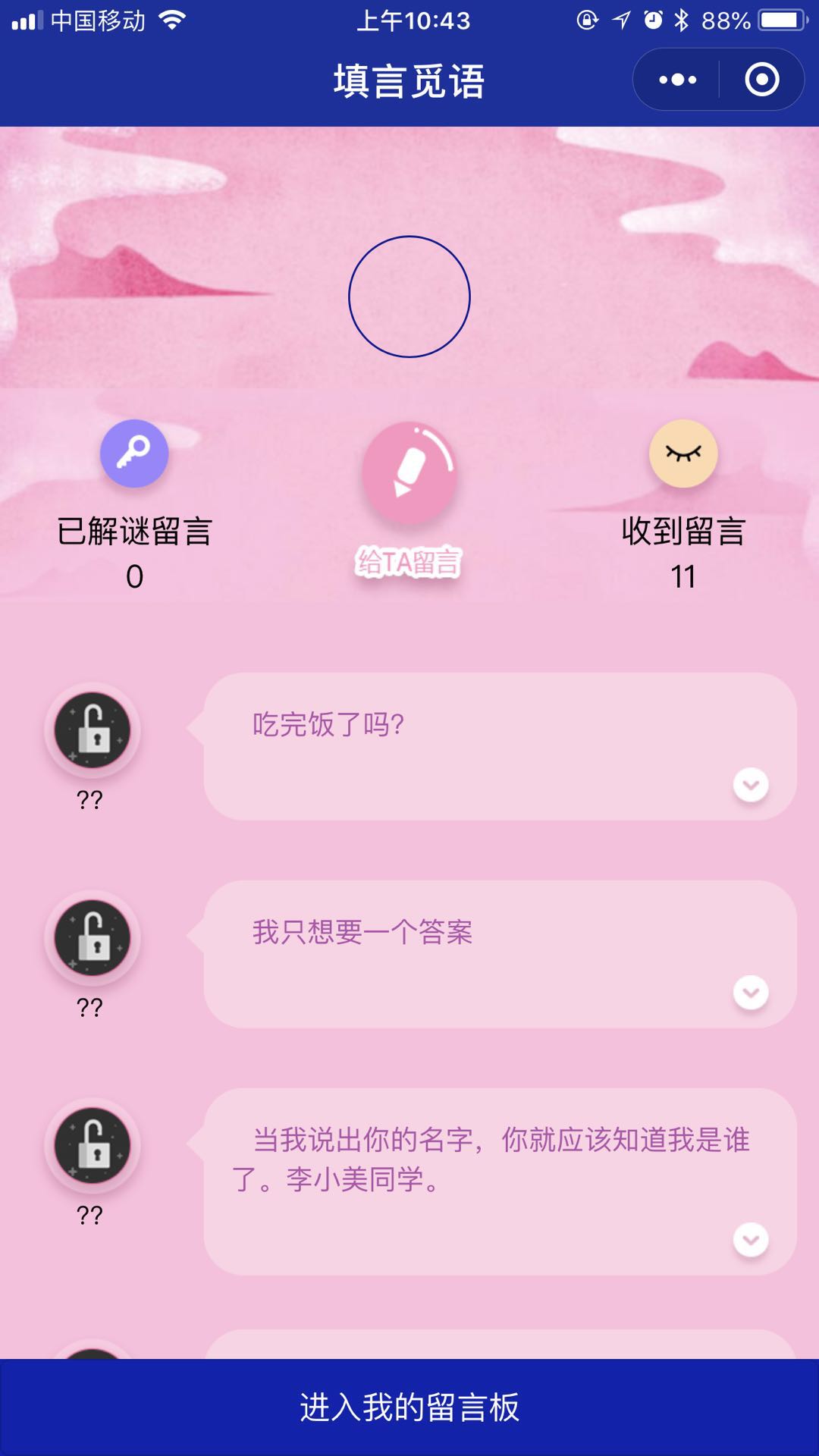 倾诉你对我想说的话,并留下线索,让我可以有机会找到你。一款积极向上的趣味留言板类小程序,恋爱、蜜月必备哦