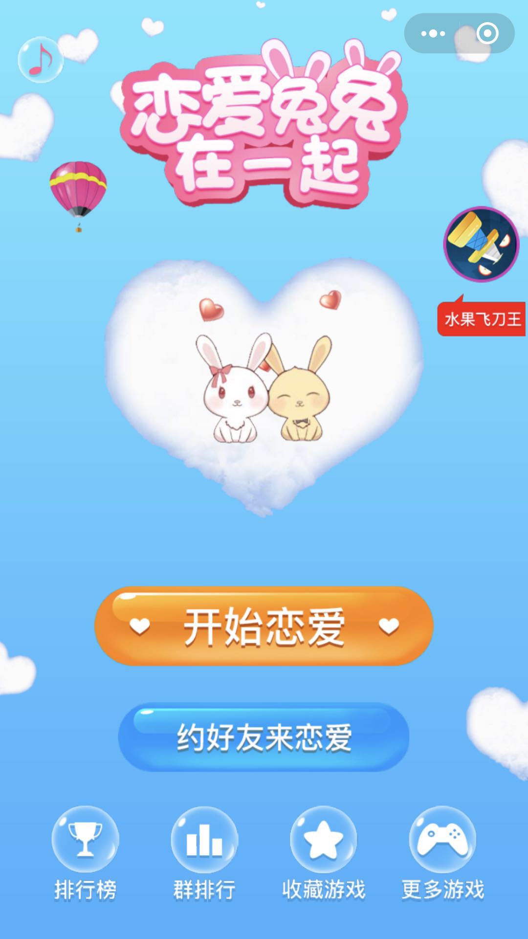 恋爱兔兔在一起微信小游戏由恋爱兔兔在一起团队开发,并于2018-08-24 11:31:51发布于小程序游戏盒子 2177.cn