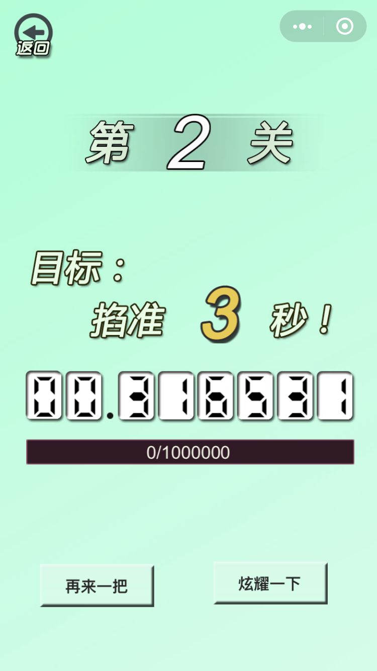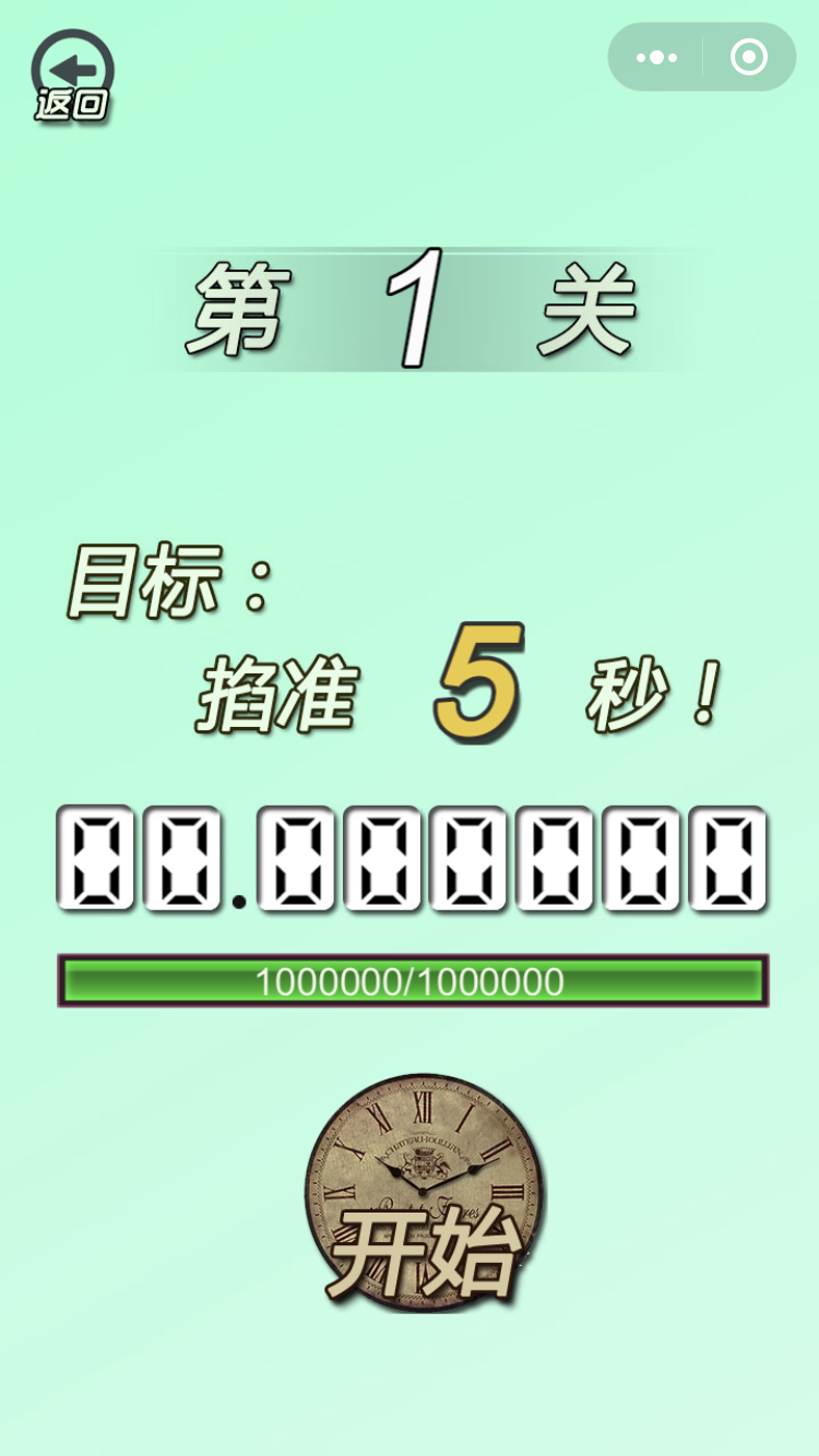 考验你的反应能力的小游戏,连续精准地掐秒,保证累计误差不大于1秒即可持续通关,看谁坚持到最后!当然过程中可能出现一些魔性的玩意来干扰你的视线,请好好努力吧(手动狗头)