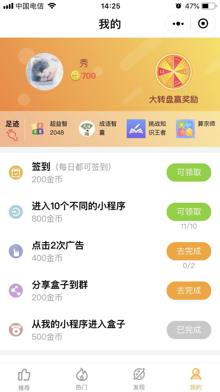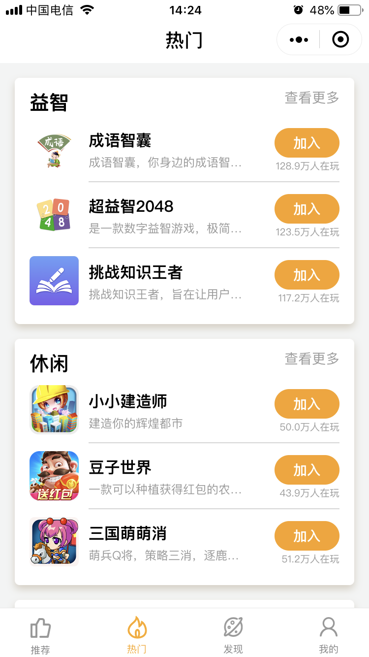 - 如果曾经开启过益智精选,益智精选会隐藏到「微信」的最上方,只要在微信首页下拉即可找到益智精选小游戏图标。