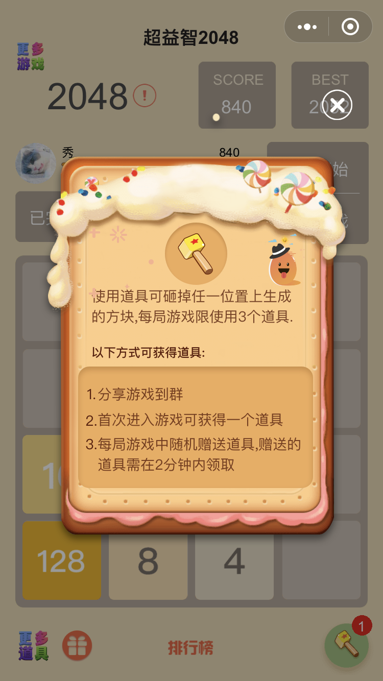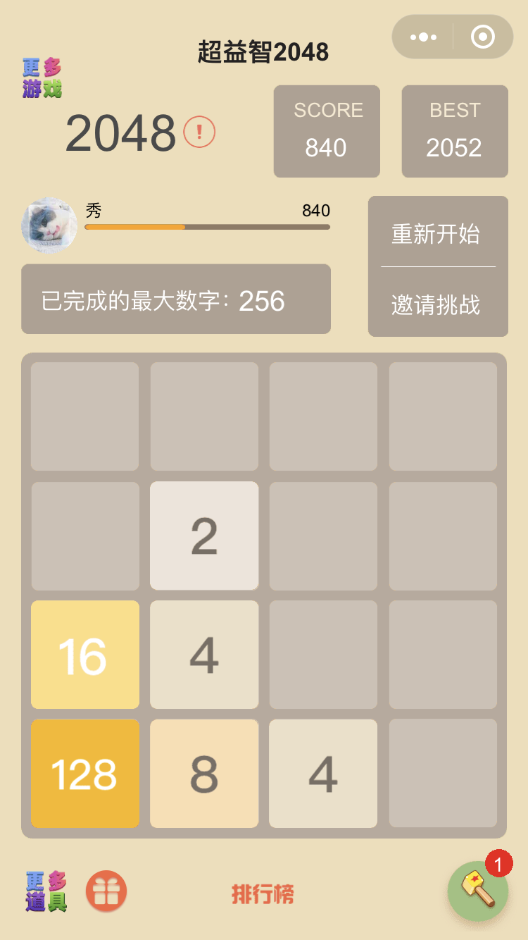 超益智2048微信小游戏由超益智2048团队开发,并于2018-10-02 14:53:48发布于小程序游戏盒子 2177.cn