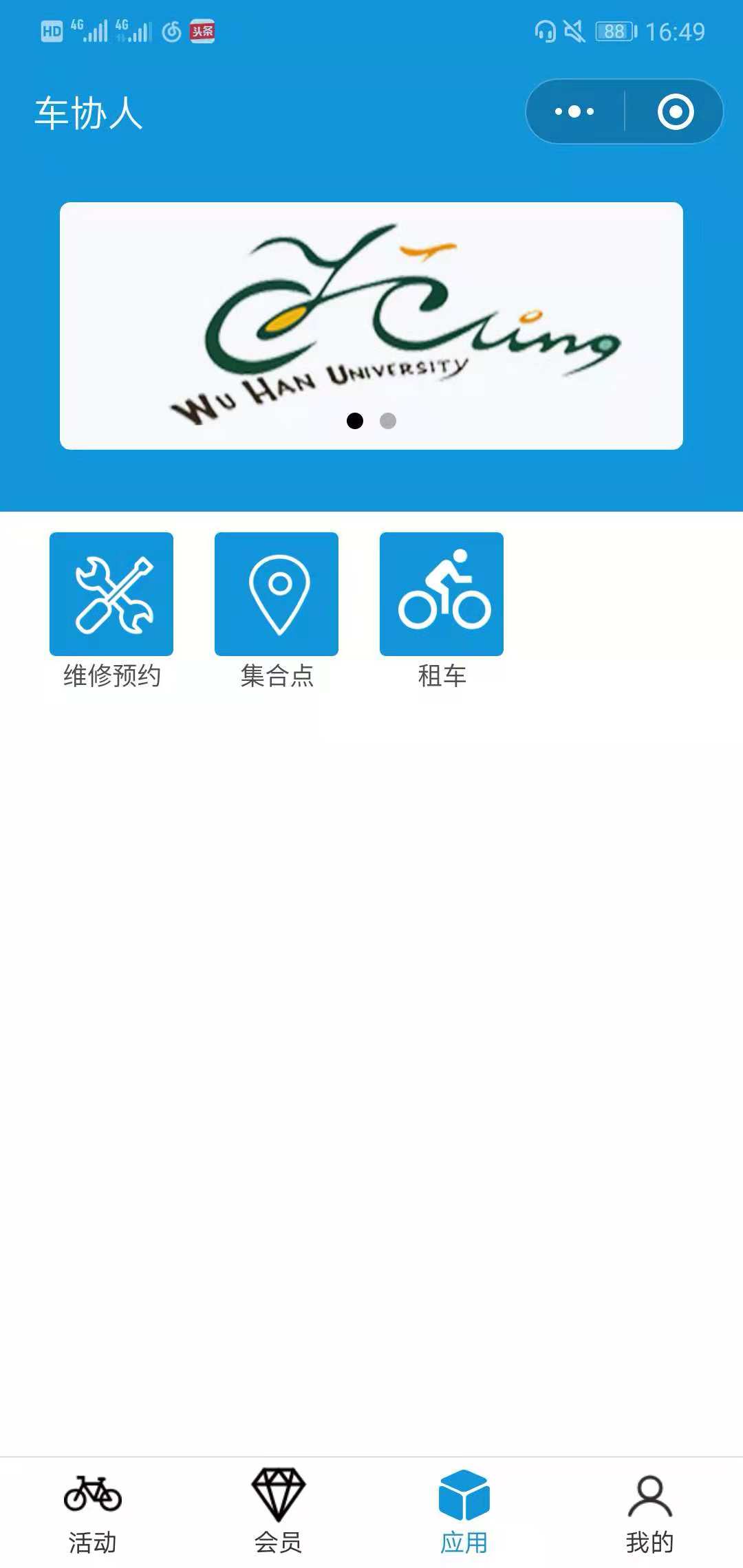 武汉大学自行车协会官方小程序,支持活动查看,维修预约,活动集合点查询,租车服务等实用功能,由车协管理层子安开发