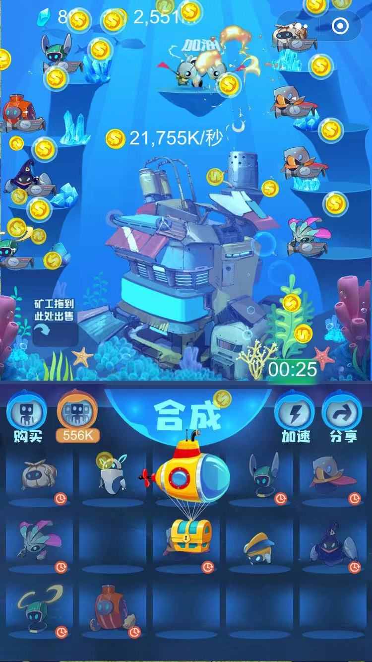 机器人题材的挖矿类游戏,深海挖矿加超级合成的全新休闲体验。游戏增加了一键合成功能,免去了其他合成游戏中繁琐的拖动与点击,另外可爱的机械风特别受女性玩家青睐,当游戏启动加速效时,会出现机器人群舞的热辣场面,是一款不走寻常路的挖矿合成休闲小游戏。