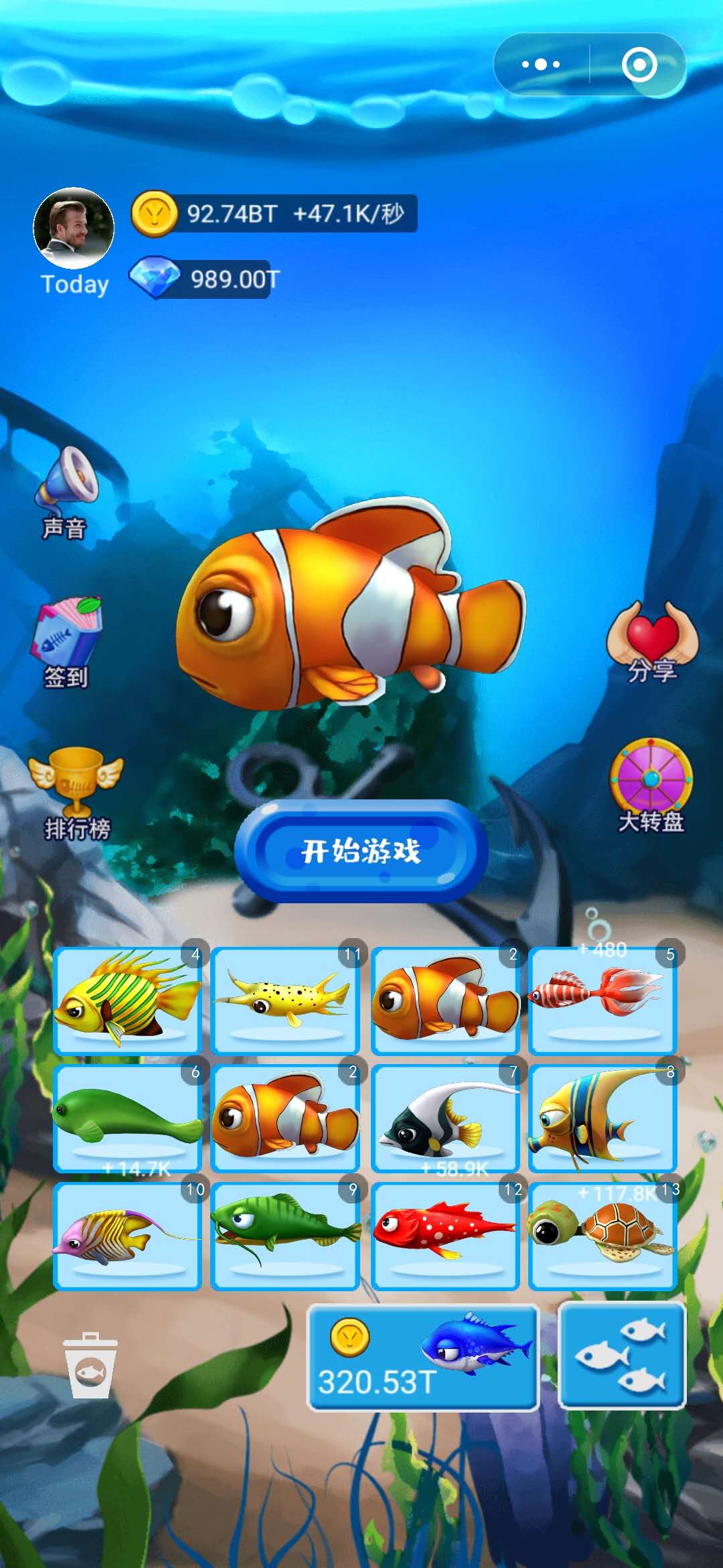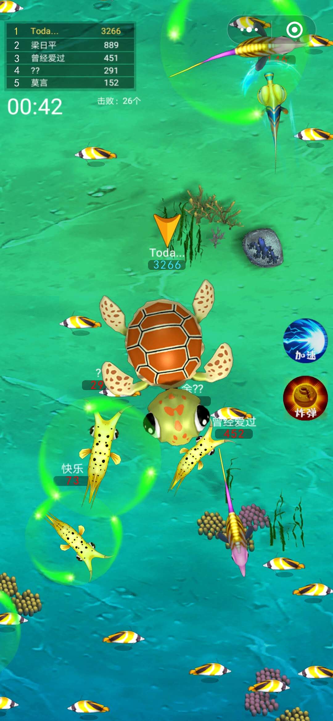 深海大战小游戏,如果是喜欢鱼类玩家的朋友一定不要错过了噢,这款小游戏在放置合成类玩法上增加了吃鱼竞技的玩法,玩家第一次进入游戏需要购买一条小鱼,把同等级的鱼进行拖拽合成到更高级的鱼,然后可以用这条鱼来进行深海竞技,每次竞技会随机匹配等级差距较小的玩家一起作战,进入作战后玩家可以不断吃掉更多小鱼来提升自己的体积同时还可以去击杀其他玩家,看到吃鱼数量比你少的玩家可以轻松击杀掉哦,在游戏中还可以使用技能,合理使用不同技能可以让自己更快的成长、追击其他玩家或躲避其他玩家的追杀,哈哈哈赶紧来一场深海盛宴!一起吃鱼称霸深海吧!