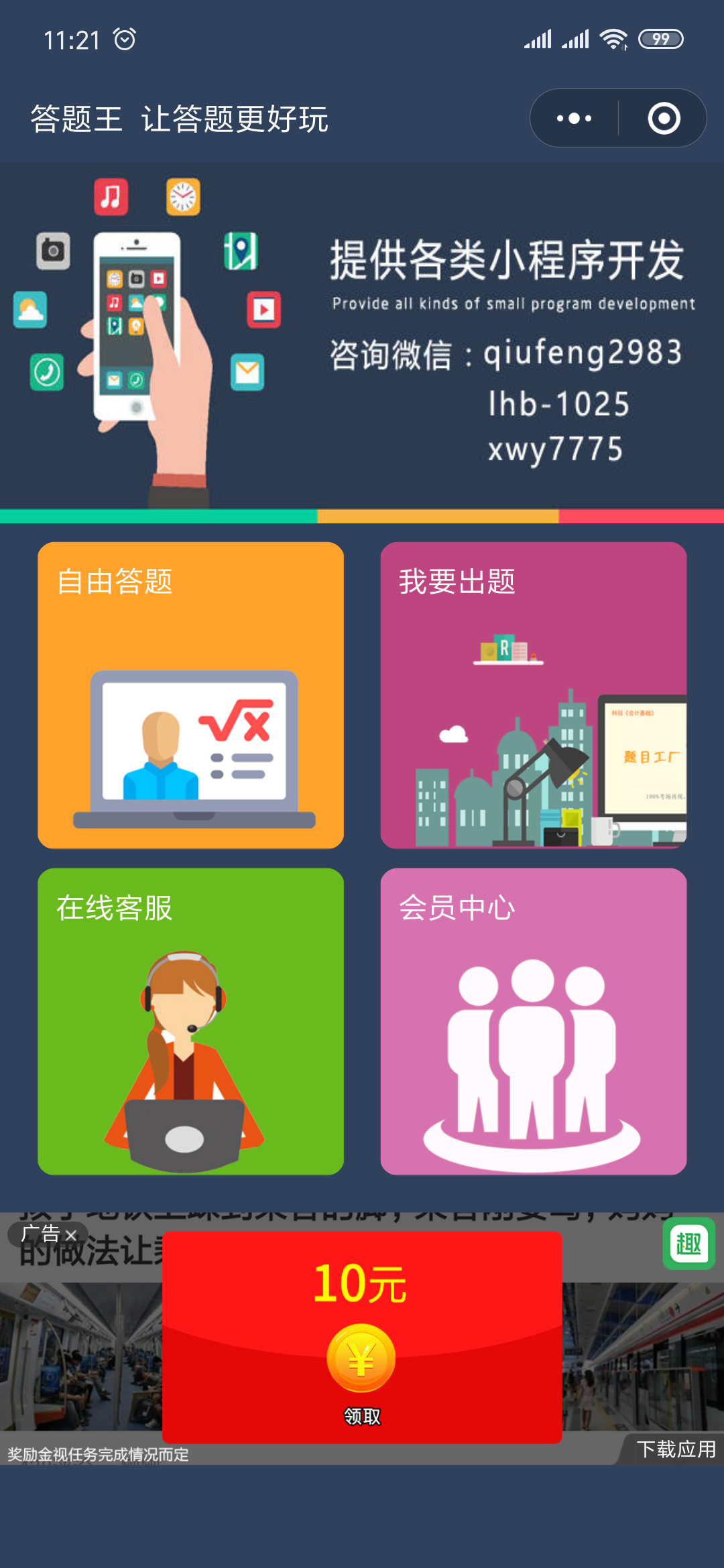 答题王小程序,在线考试,在线答题,在线出题让答题更好玩!不仅仅是学校、企事业单位、政府部门都可以使用本答题小程序给用户出题和在线考试。无需正襟危坐电脑前,掏出手机即可答题考试,充分利用碎片化时间。 我们答题小程序都是全部免费开放给所有人出题考试的。大家出题考试我们都是不收费的,都是免费使用我们的答题系统的。 答题考试小程序应用场景: 1、商家宣传,企业广告,设置自己的产品知识问答,客户答对了可以按照设置的奖励规则拿到微信现金红包。 2、公司、企业、微商团队内部业务知识培训,在线考试。 3、在线问卷调查,只要填写了,就可以拿到微信红包! 4、培训学校、中小学教育,等培训考试机构用来做在线考试。 5、政府单位购买学习十九大、党章等知识培训,打开手机即可答题。