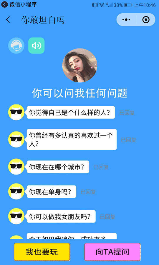 "真心话坦白局"是一款在朋友圈十分火爆的真心话大冒险类趣味游戏,所有的玩家之间都可以来上一场刺激的真心话大冒险,你在这里可以尽情放松自己的思维方式,用真心来回答所有的问题,也许通过这里就能找到你命中注定的人,也可以邀请你的好友一起来参与,所有的问答都采用匿名的方式,不要担心被暴露哦。