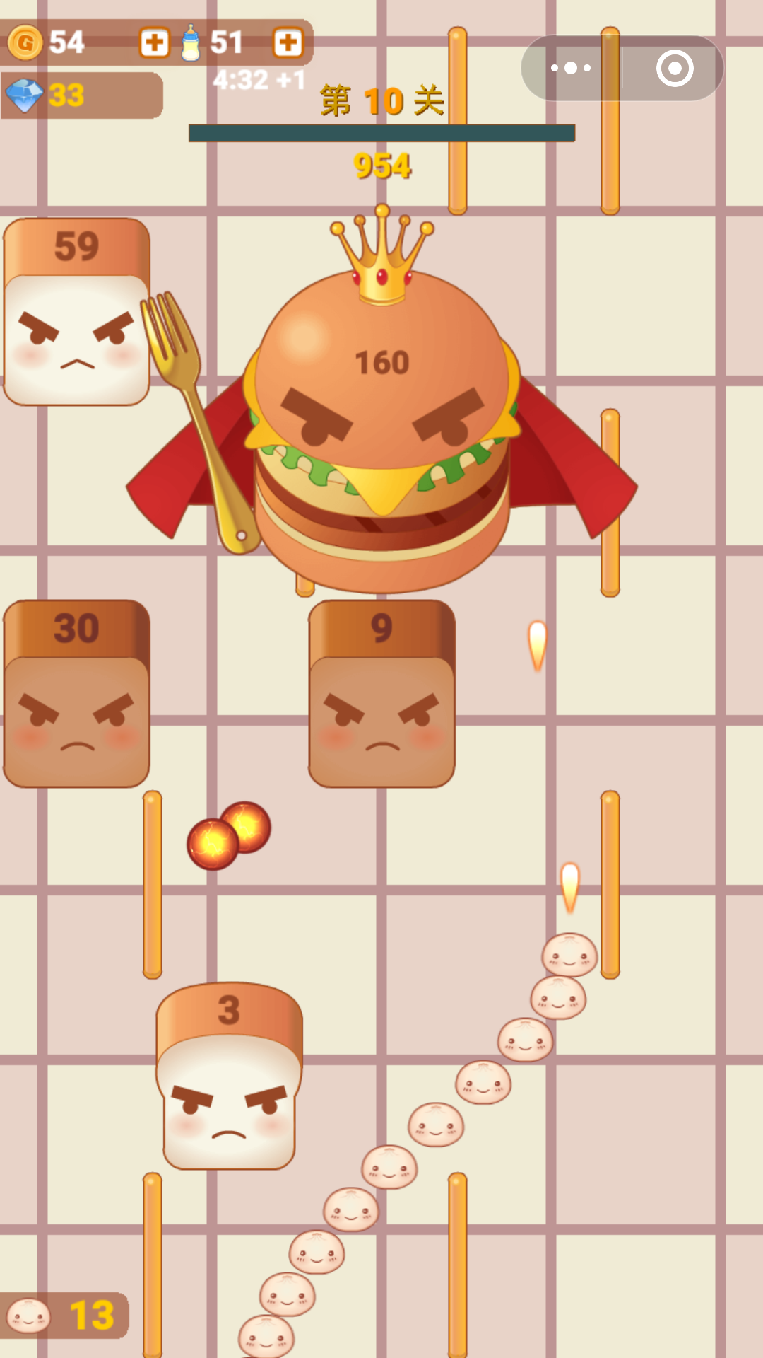 这是一款有趣的射击小游戏。自古以来面包帝国与包子国势不两立,邪恶的汉堡大王一直想吞并弱小的包子国,于是率领面包军团对包子国发动进攻。这是一场在餐桌上的逃亡反击战,通过合理操作,带领包子小伙伴们突破面包军团的包围圈。