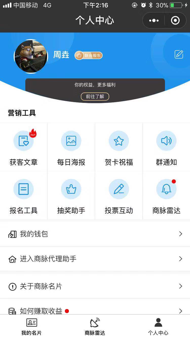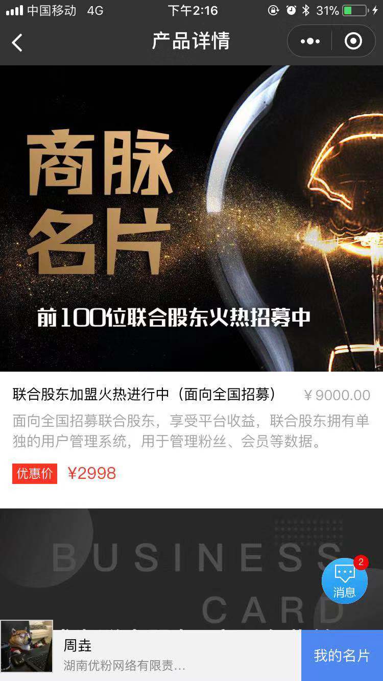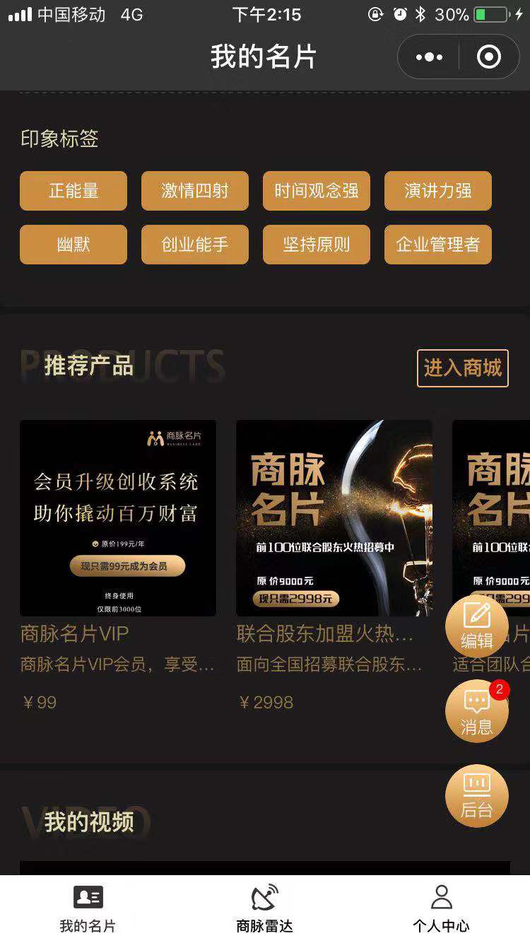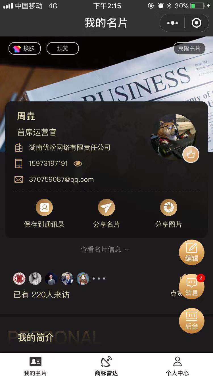 商脉名片是由湖南优粉网络有限责任公司自主创新研发的一个智能营销平台,整个产品线分为个人免费商务版、个人会员商务版、企业独立商务版,我们是一家致力于提升商务人士营销业绩的互联网公司! 团队核心成员来自北京、深圳两地著名互联网企业。公司坚持以“产品精益求精,用户价值第一”的发展方向,为商务人士打造出智能社交新引擎——商脉名片,赋予了新一代智能名片:带人脉、助销售、会赚钱、可扩展等新特性,助力一亿商务人士提升商务社交效率,赋能7000万商户企业提升营销业绩。 商脉名片结合AI技术,紧跟时代趋势,打造高性价比产品和服务,搭建新一代商务人士创收型名片。 目前,我们服务的客户已覆盖全国,正处于高速发展阶段,拥有多项技术产权和先进的商业模式,合作政策开放,真诚地邀请全国各地的朋友前来合作。