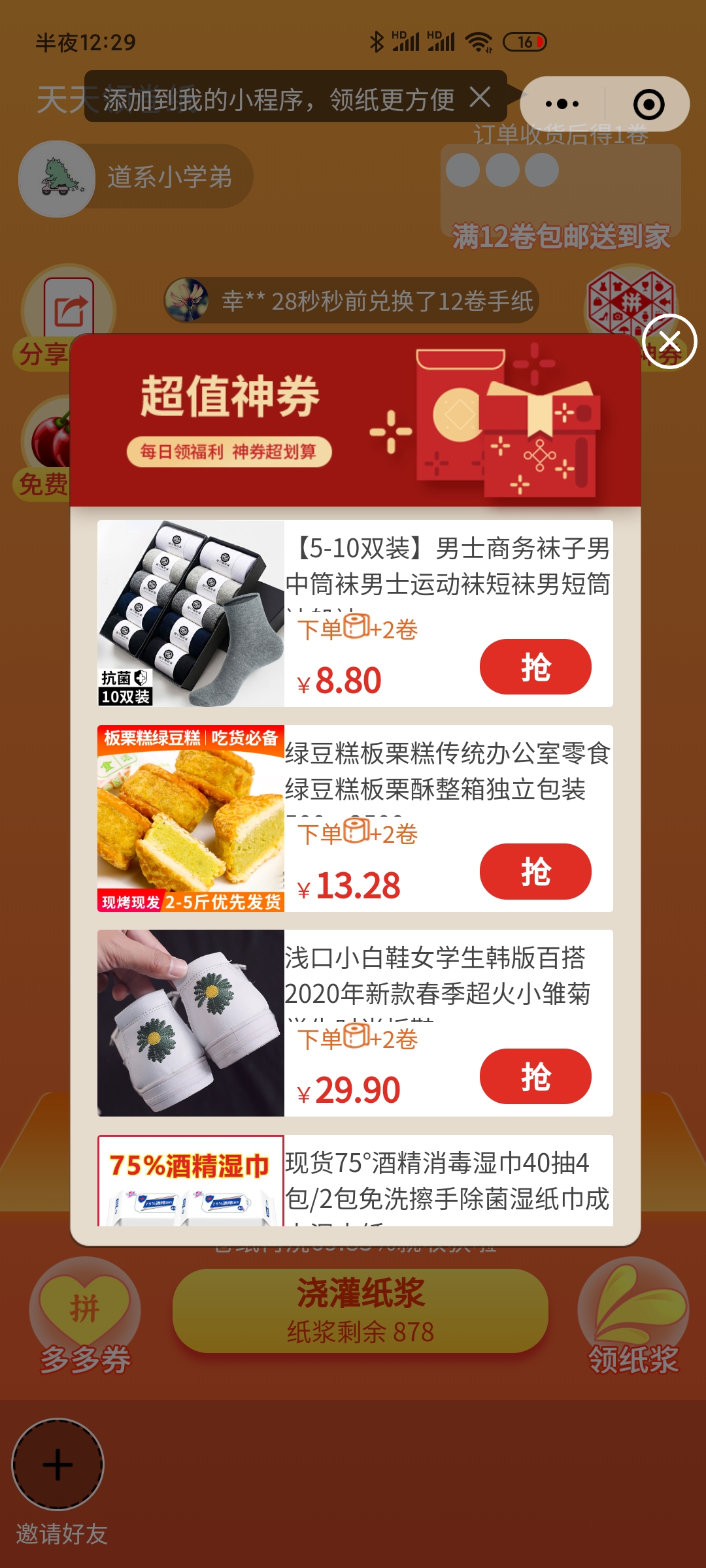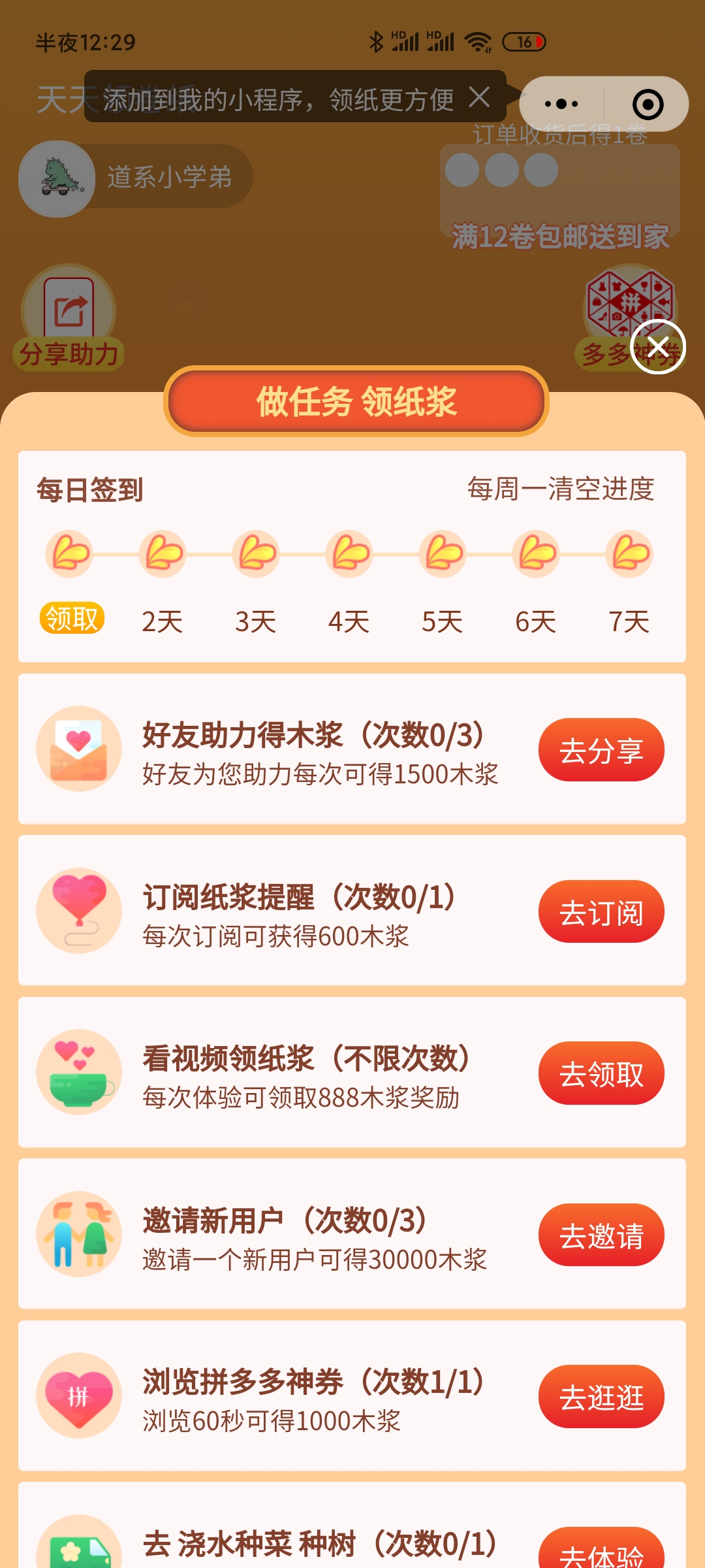 - 在微信中搜索“天天领卷纸”即可进入小程序