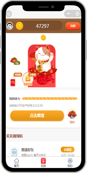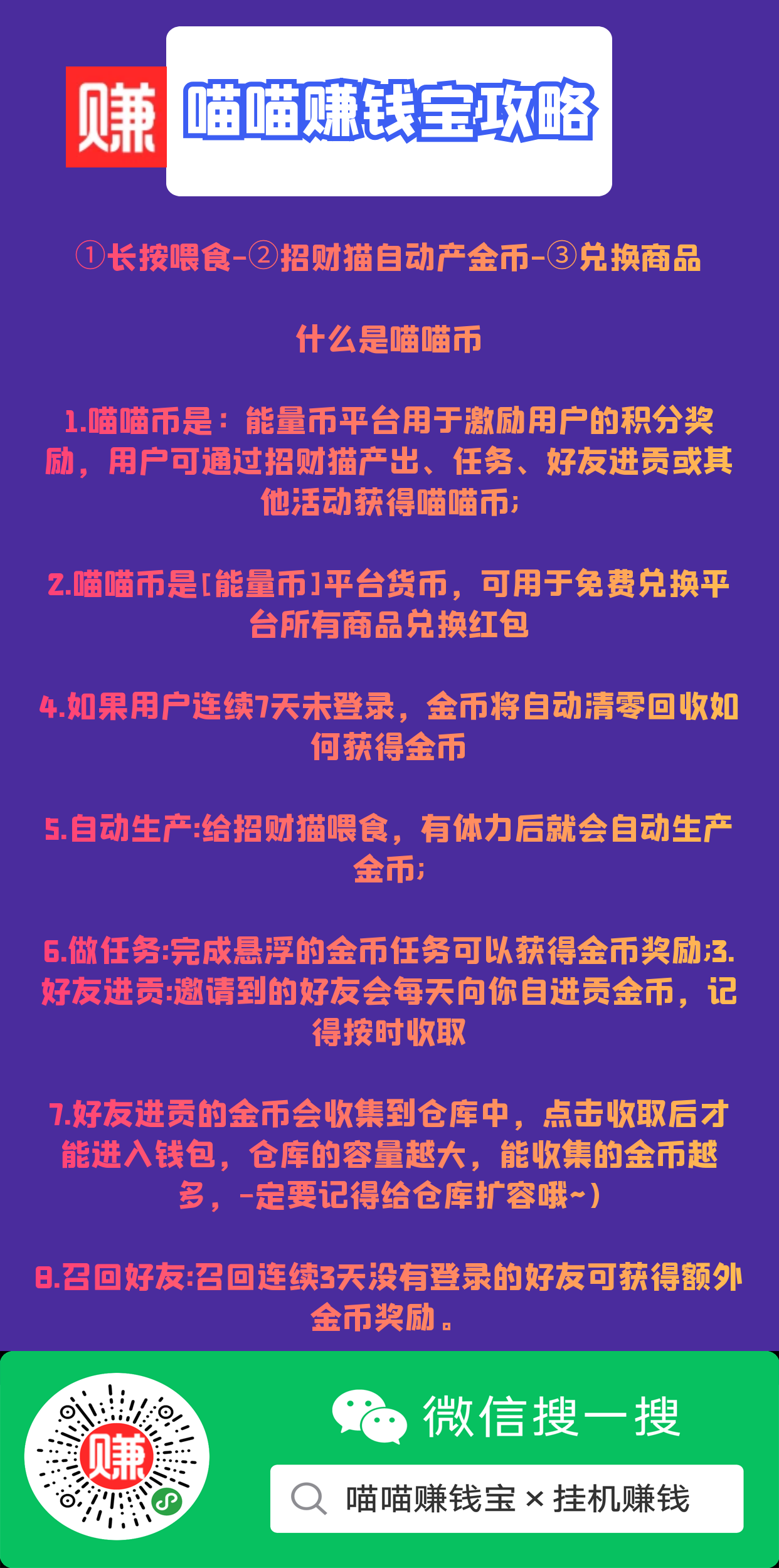 喵喵赚钱宝 1.喵喵币是:能量币平台用于激励用户的积分奖励,用户可通过招财猫产出、任务、好友进贡或其他活动获得喵喵币; 2.喵喵币是[能量币]平台货币,可用于免费兑换平台所有商品兑换红包 4.如果用户连续7天未登录,金币将自动清零回收如何获得金币 5.自动生产:给招财猫喂食,有体力后就会自动生产金币; 6.做任务:完成悬浮的金币任务可以获得金币奖励;3.好友进贡:邀请到的好友会每天向你自进贡金币,记得按时收取 7.好友进贡的金币会收集到仓库中,点击收取后才能进入钱包,仓库的容量越大,能收集的金币越多,-定要记得给仓库扩容哦~) 8.召回好友:召回连续3天没有登录的好友可获得额外金币奖励。