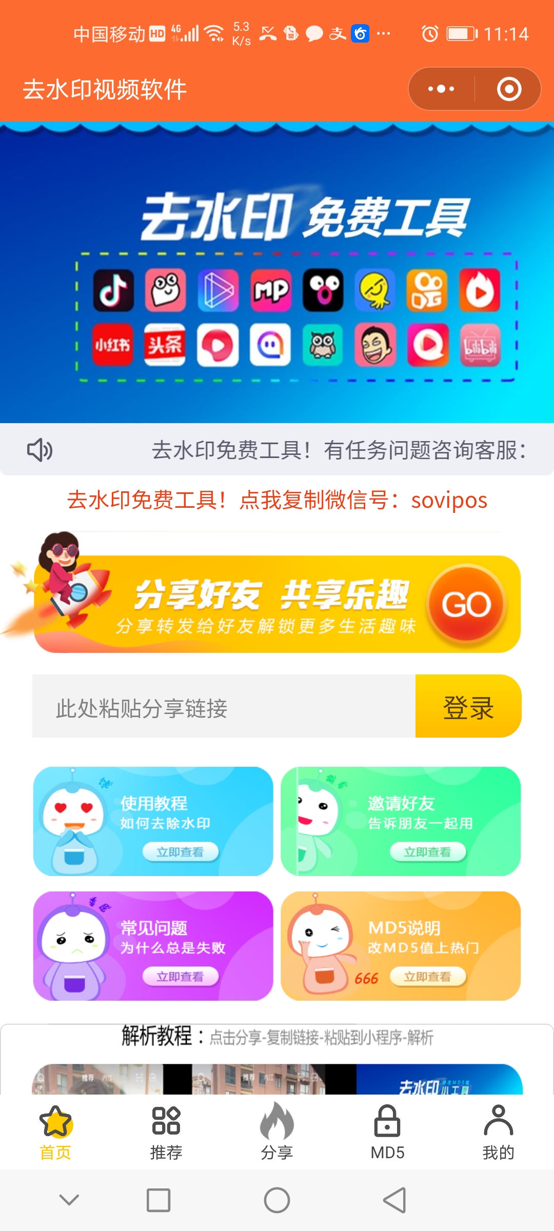 - 使用微信扫描页面上方二维码进入去水印视频软件