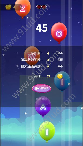 3、当气球上升到顶部还未消除后便会失去一颗生命值;