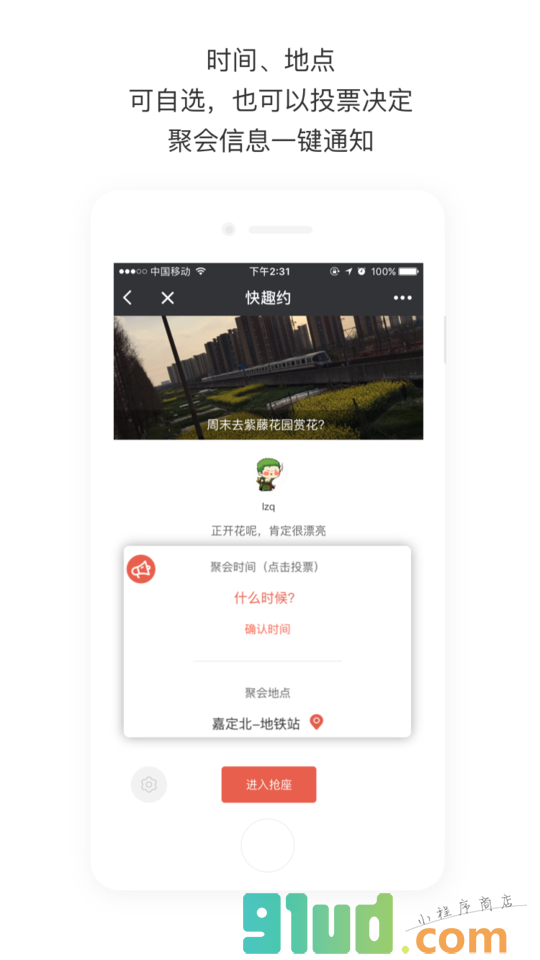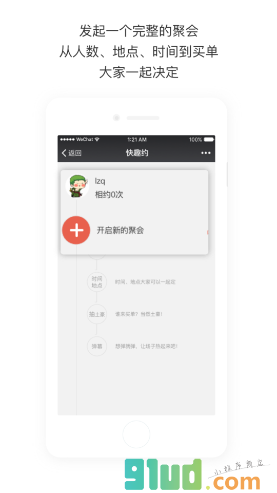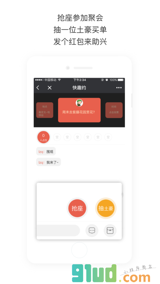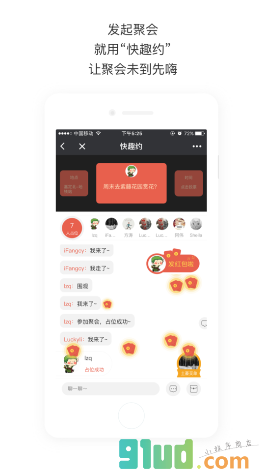 聚会就用快趣约!“快趣约”不仅收集参加人数,还能同时收集大家对时间,地点的意见。更能实时聊天发弹幕,满屏红包大家抢,抽个土豪来买单等游戏。让你的聚会未到先嗨!