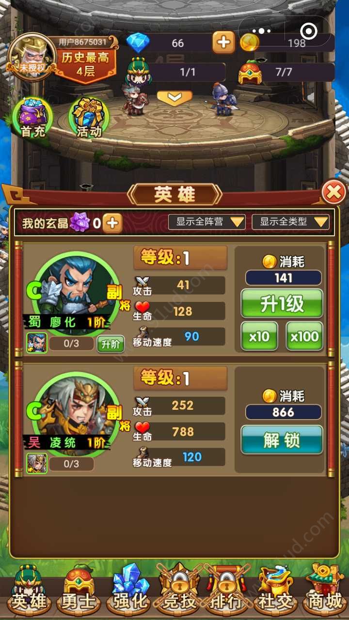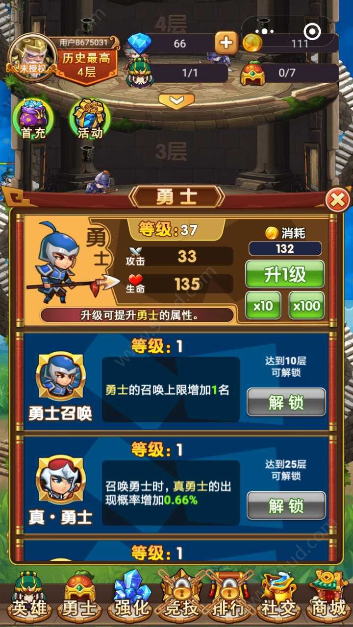 3、游戏玩法非常的简单,召唤勇士和武将来闯关每一层消灭敌人就可以了。