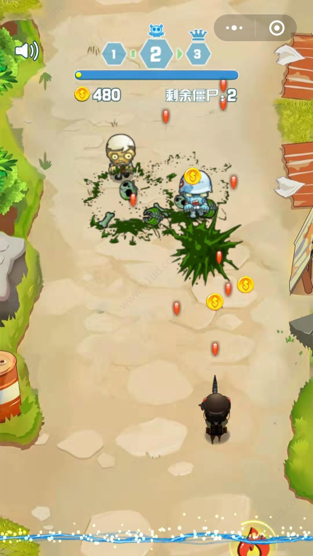 僵尸别跑小游戏,这是一款射击暴打僵尸的小游戏,游戏玩法简单粗暴,按住屏幕就可以射击僵尸,左右移动可以调整射击方向,在最短的时间里消灭一大波僵尸能让你快速通关,如果不小心你被僵尸咬到了那么游戏就失败了,只能等待复活重新开始游戏。91ud小编觉得这款小游戏真的很鸡肋,为什么了,非要按住屏幕才可以自由射击,手指松开屏幕就暂停射击了,当你暂停了的时候僵尸还是会前进来咬你,如果你中途有点什么事情要拿出手来解决,这时候游戏真的非常有可能就失败了。