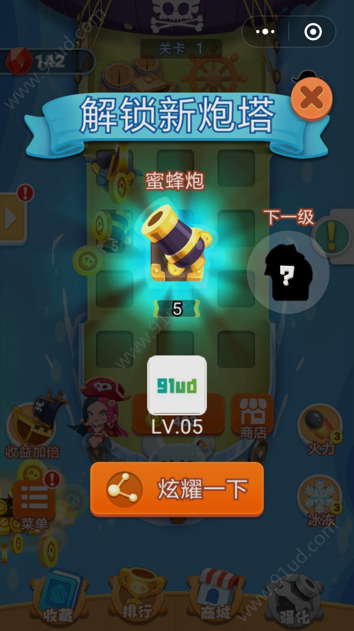 3、用所获得的金币来升级炮台和武器,也可以用工具来冻结和增加攻速快速击杀怪物;