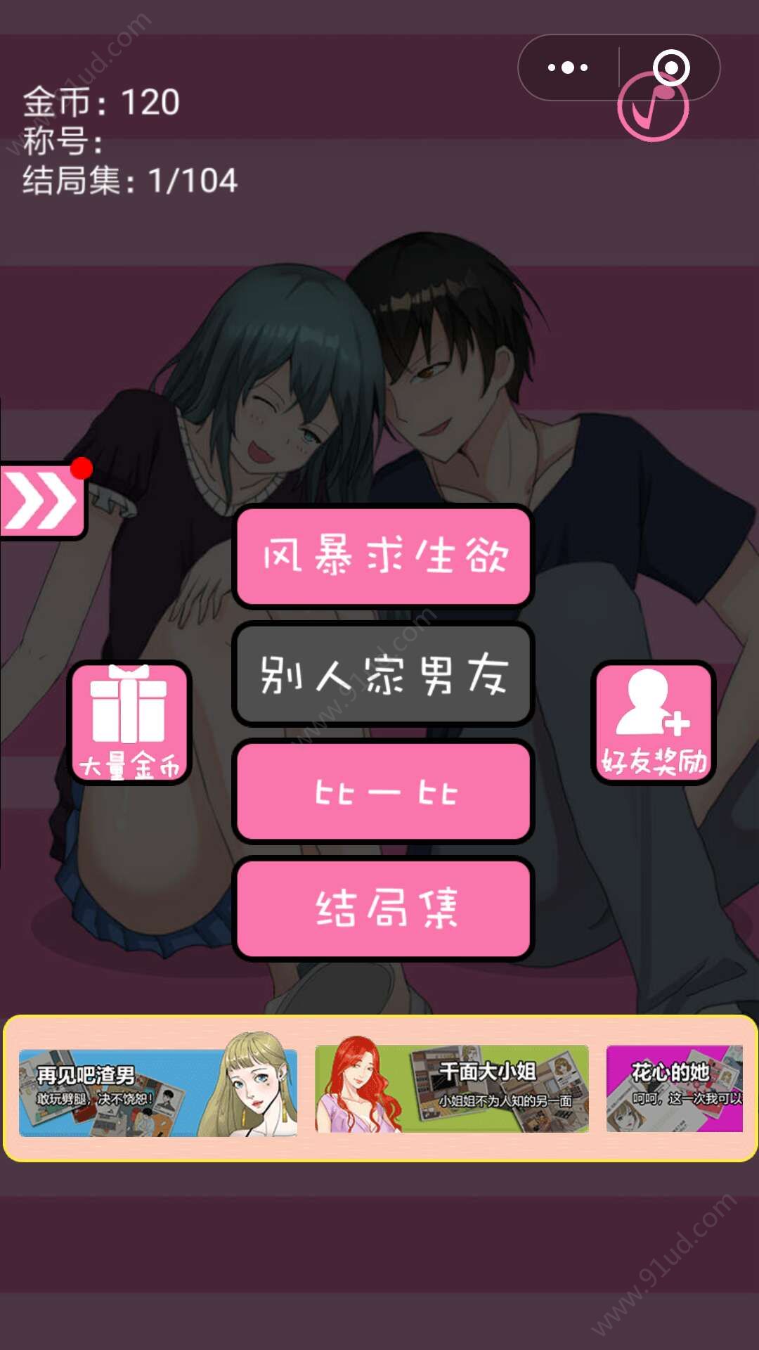 恋爱生存法则小游戏,哇哦~小伙伴们今天就是情人节了哦,单身的小伙伴们又要被虐了,不过这款小游戏真的非常有趣,必须推荐给大家,想要知道自己的情商高不高吗?如果有女票了出现这些问题该怎么正确回答,这款小游戏都可以告诉你哦,不如来试试吧!分为多种模式,风暴求生欲、别人家男友、比一比、结局集让你来玩,小编觉得风暴求生欲蛮好玩的哦,分为主线关卡和神秘关卡每通过一关就可以进入到下一关哦,赶紧来玩起来吧!