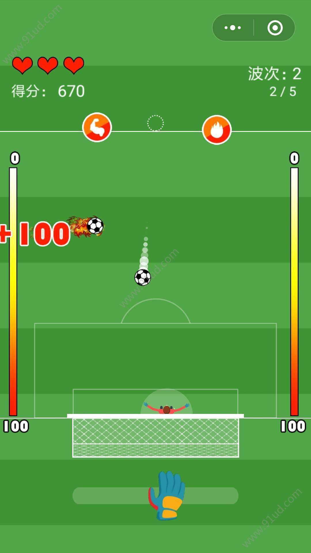 3、足球弹到两边框框还可以获得分数,找准角度在扑球哦;