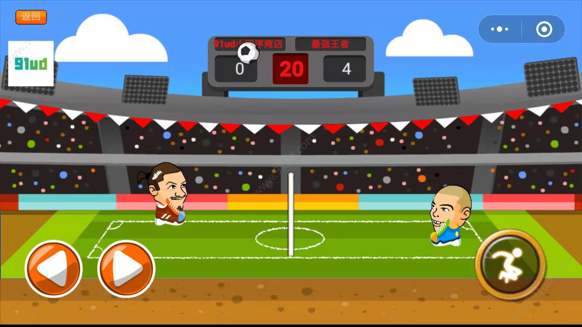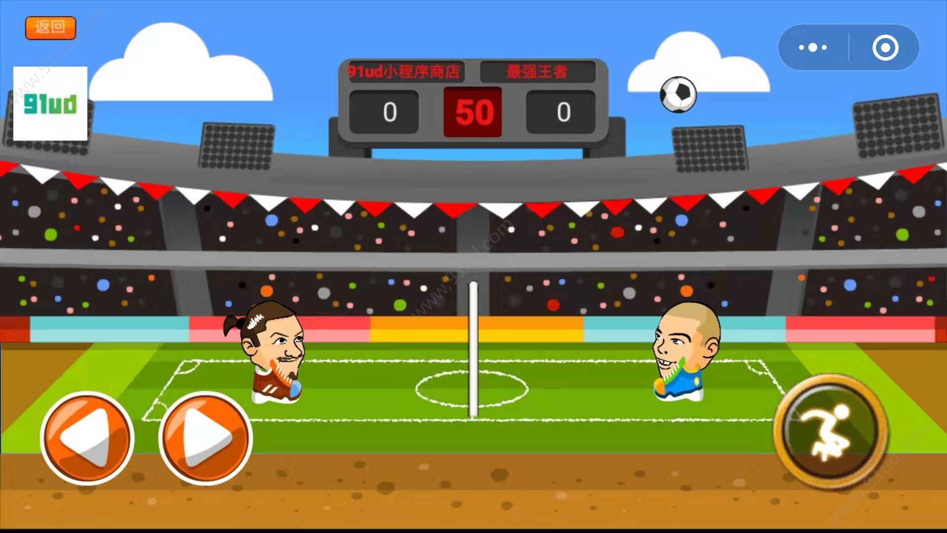 头顶足球小游戏,这是一款非常好玩有趣的足球体育类小游戏。玩法非常的奇特哦,用头顶来传球,而且是1V1的这种哦,玩家需要很迅速的来操作游戏中的人物,前后控制然后点击用头来回击过去,不能让对方传过来的球落地了哦,如果落地了那么就游戏失败。如果你喜欢玩足球,平时生活中没有时间去足球场玩就可以在这个小游戏上感受足球带来的乐趣,玩法非常的真实,自由匹配到人物一起来对战。