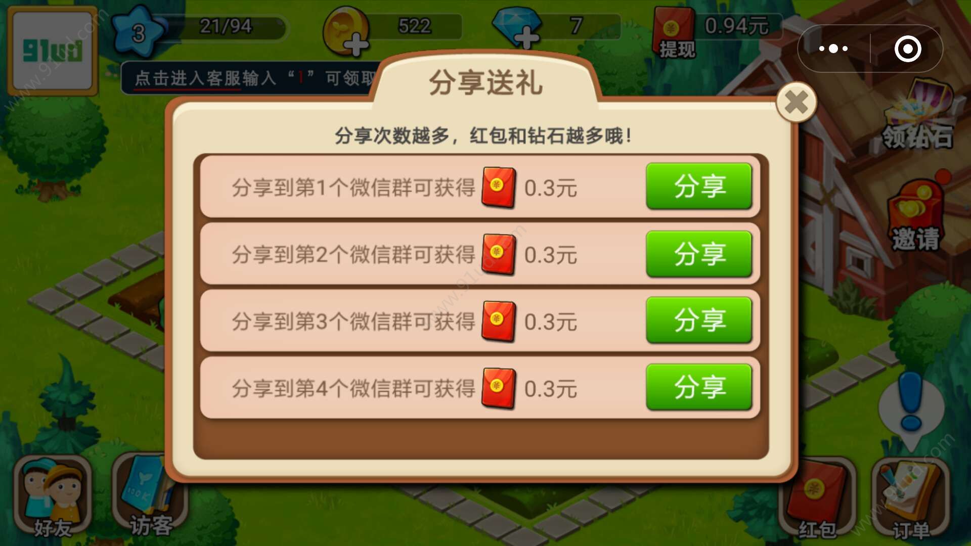 1、分享游戏到第一个微信群可以获得0.3元红包;