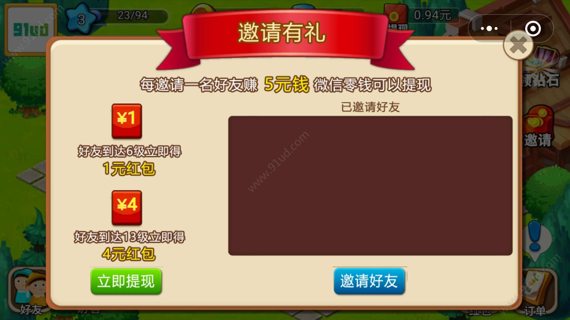 3、每邀请一名好友赚5元钱,好友达到6级既可以领取1元红包。