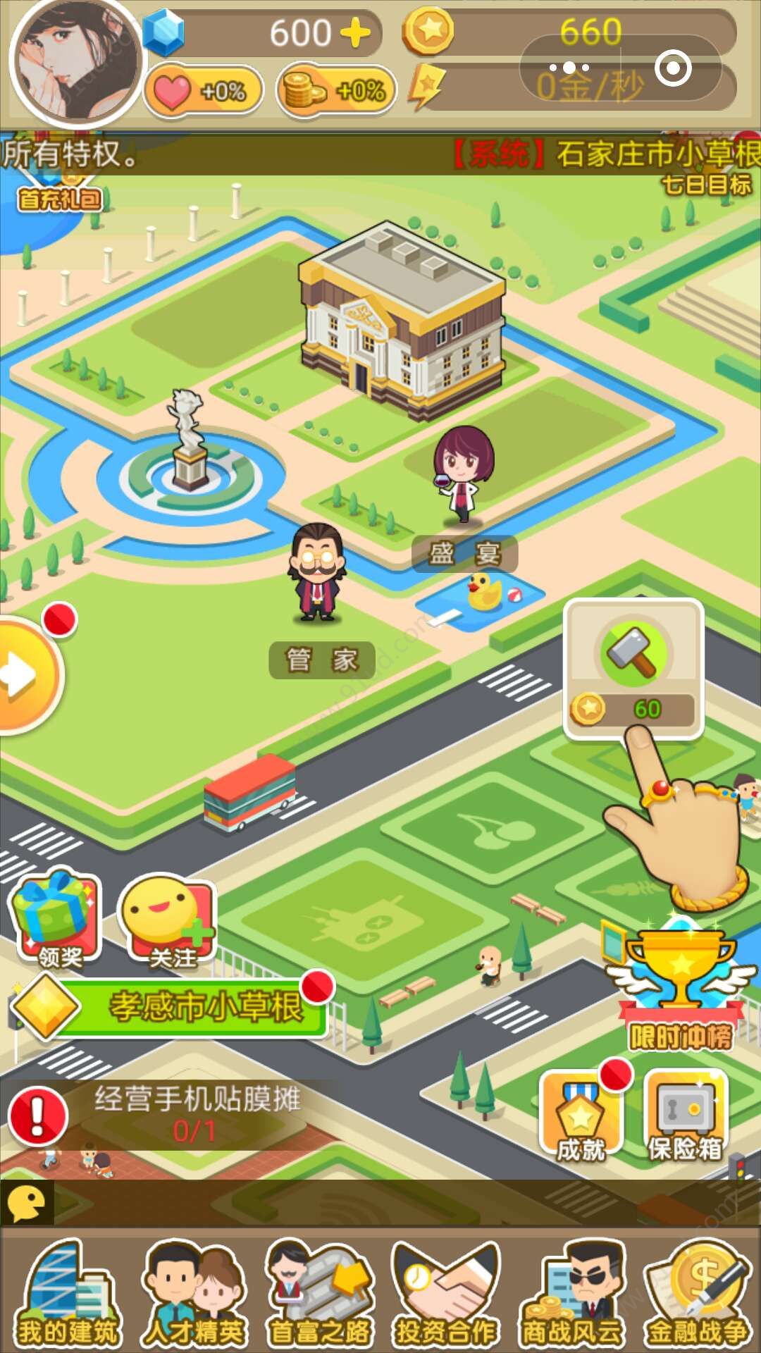 3、每天登陆游戏后可以领取到相应的金币奖励,当你的建筑物等级越高,获得的收益也就越多哦,玩起来的乐趣更加多。