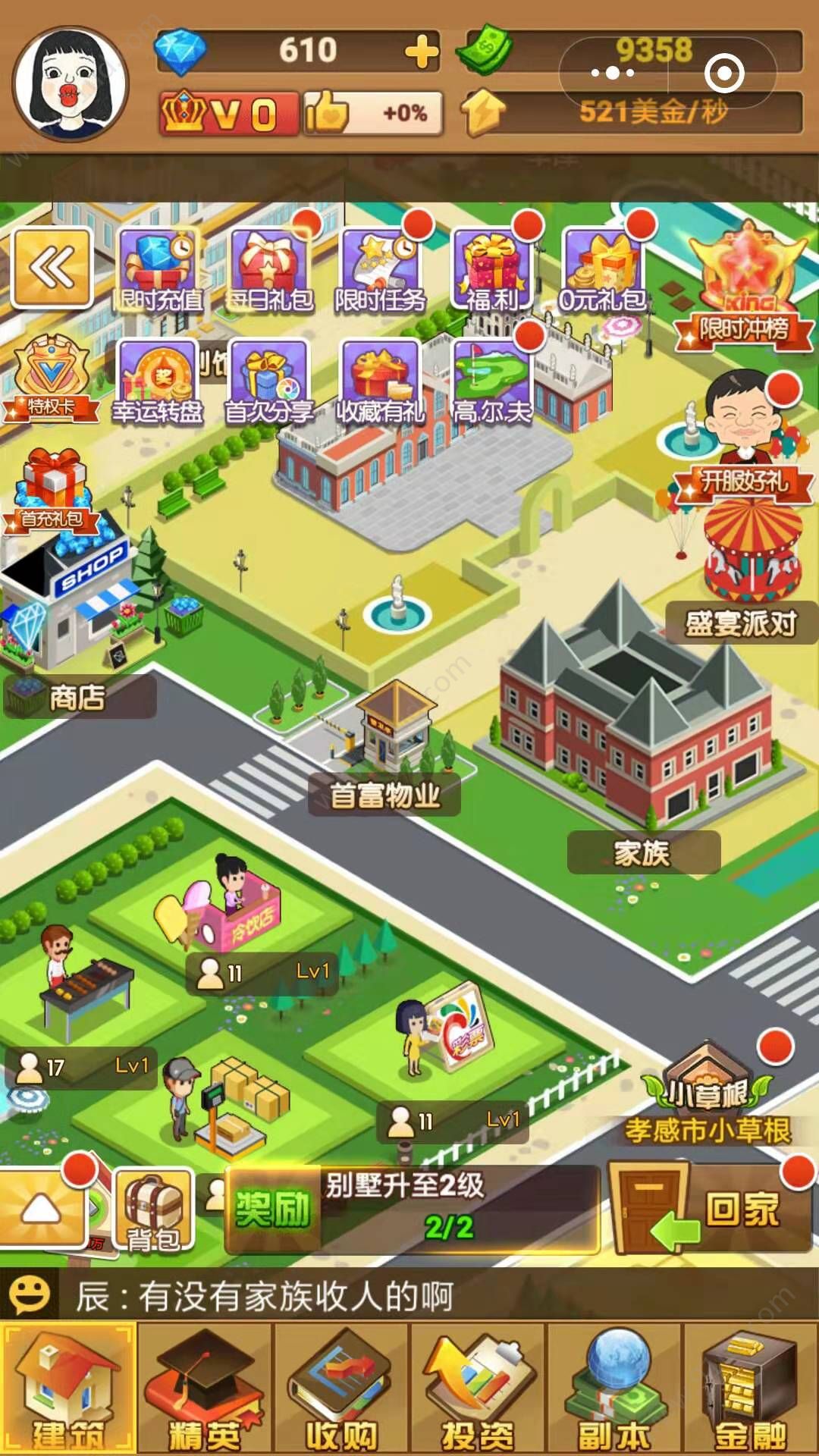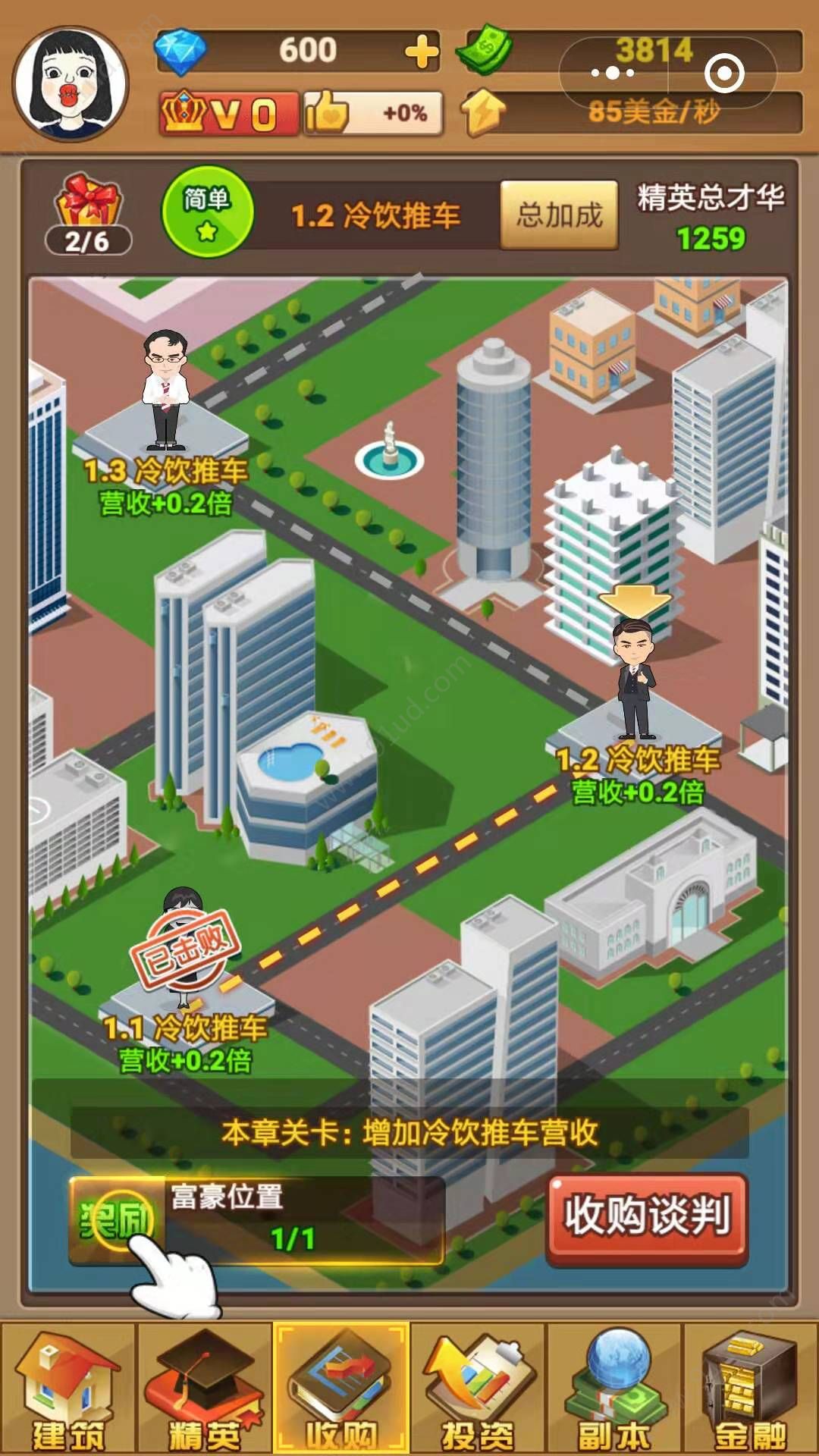 小秘书:老板我们只剩下100块钱啦,要怎么实现成为首富的梦想啊!诶,那里有家凄凉的冷饮店,一起去看看吧!试试派出手下的精英收购这个冷饮店。开始收购吧,居然还想反抗,再来一次彻底击溃他们。成功了,现在可以去建造我们的产业了。