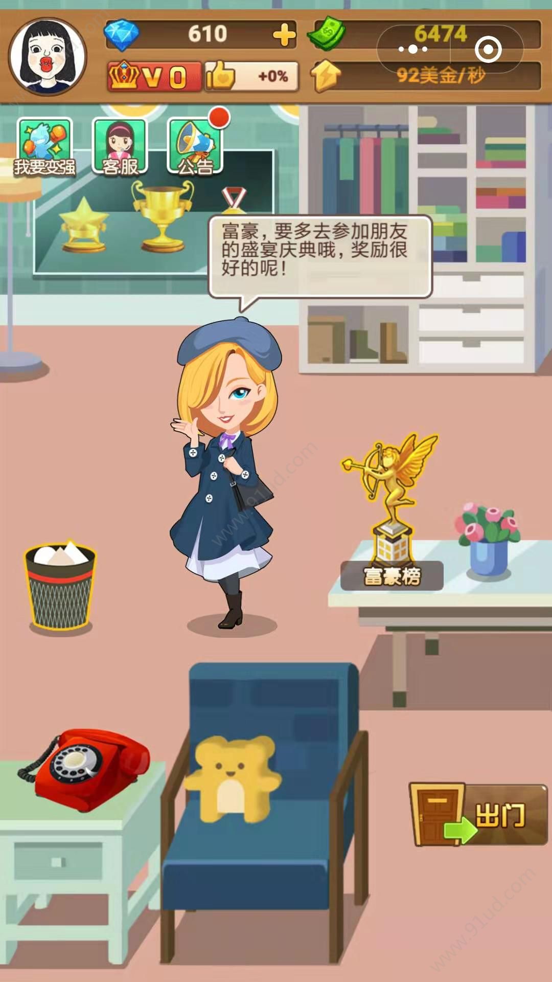 3、玩法简单剧情有趣,就看你能不能赚到1000亿哦,还可以将游戏分享给好友。