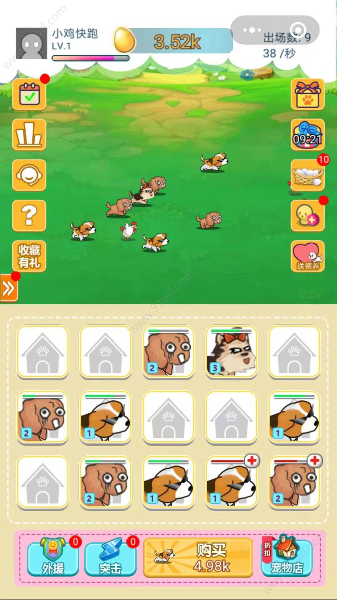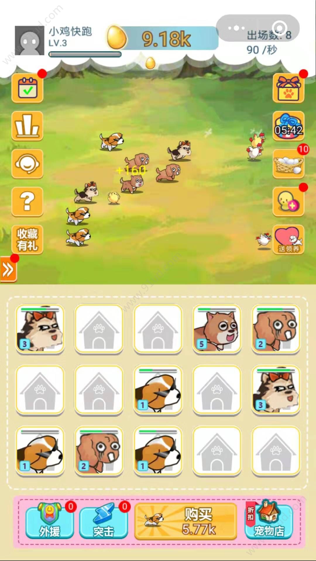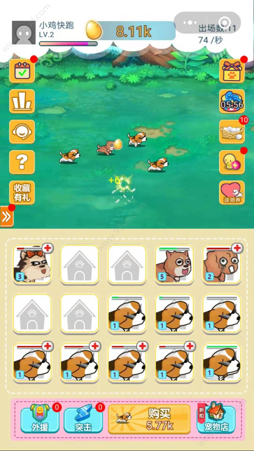 小鸡快跑ol小游戏,这是一款在线合成小狗抓小鸡的合成类小游戏。不断的合成你的牧羊犬狗狗,抓捕到处乱跑的小鸡。今晚吃鸡,靠你了!开局一条狗,吃鸡全靠吼!这款小游戏真的非常的萌哦,可爱的狗狗看到鸡后就要追赶,来捡鸡蛋,捡的鸡蛋越多,你就可以购买更多狗狗,将同等级的狗狗拖拽到一起升级更高级的狗狗来赶鸡。每天登陆游戏还可以获得更多鸡蛋奖励哦,喜欢玩这类放置合成小游戏的你不要错过哦。