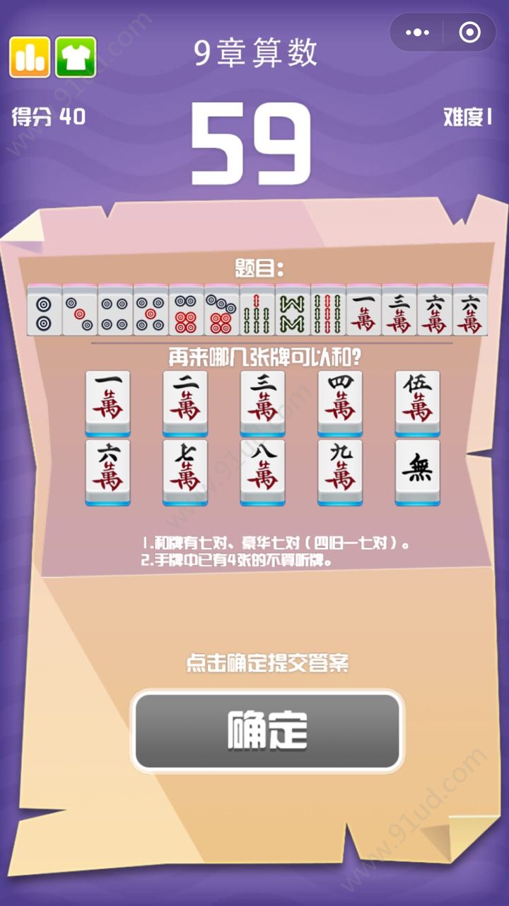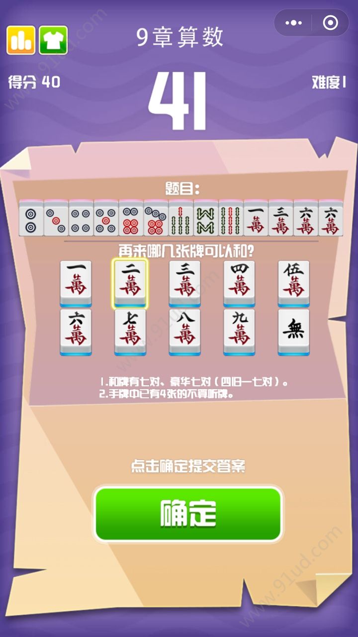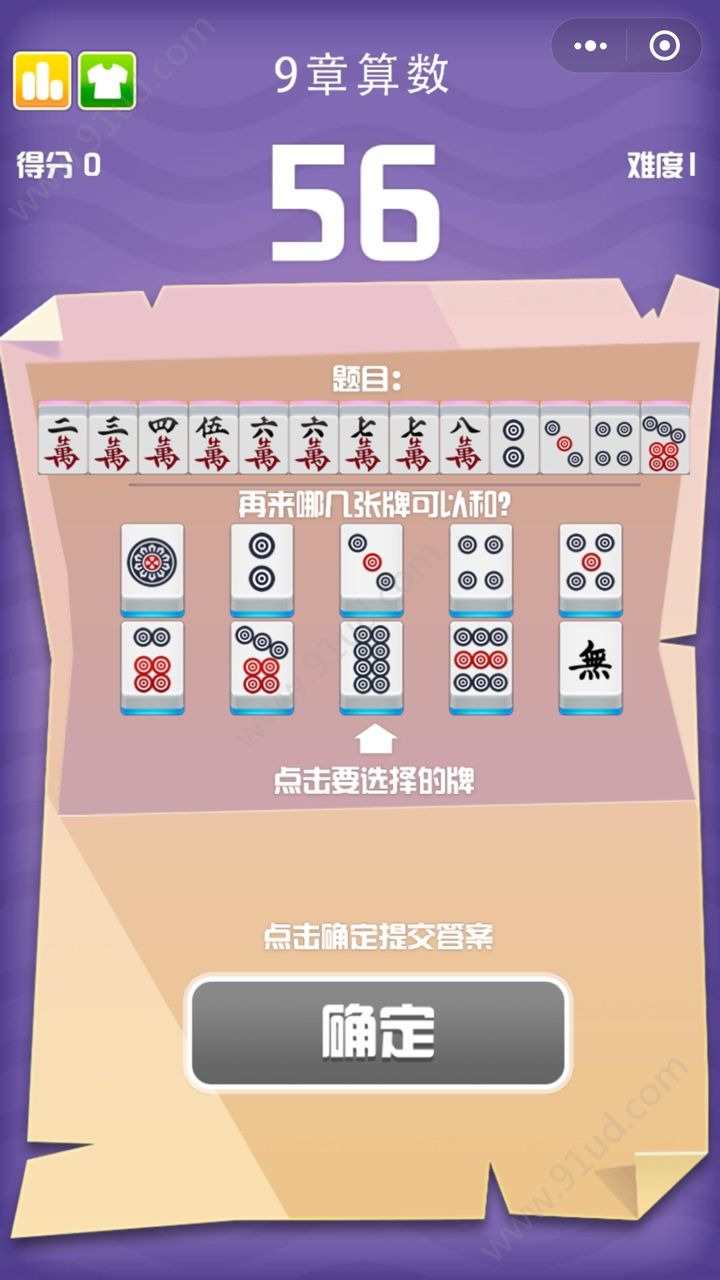 9章算数是一款超级好玩的棋牌类型小游戏,你千万不要以为是让你来进行算术测试哦,O(∩_∩)O哈哈~,小编也是这样被糊弄过来的,进入了游戏才发现并不是我想象中那样的玩法,这款游戏需要考研你是不是麻将玩家,如果你会打麻将那轻而易举找出正确的胡牌答案,小编就是麻将高手,这些题目完全难不倒我,你也快来挑战一下吧。