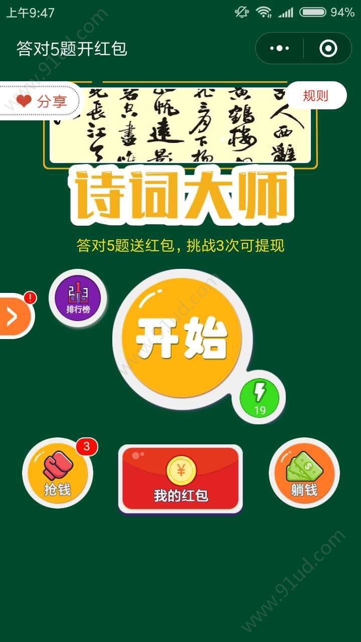 2、每一轮挑战随机闯过五关,连续答对就可以获得随机现金红包,支持提现;