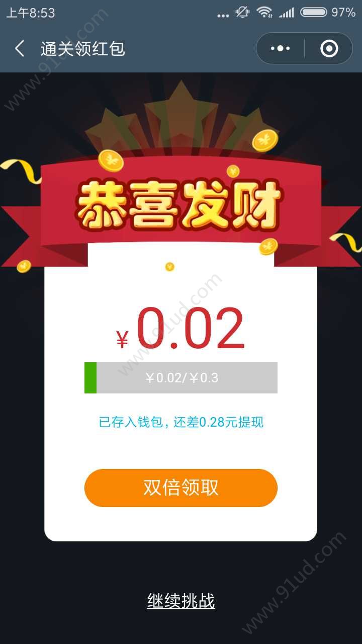 3、红包0.3元(最多通关3次)即可提现,祝大家中红包大奖。