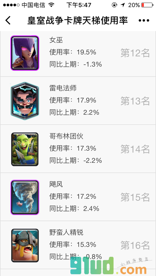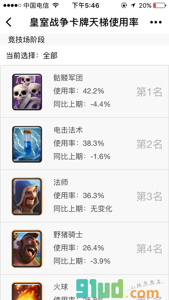 电竞爸爸每天更新游戏大数据并进行计算,使玩家们可以随时查询《皇室战争》游戏中各个阶段竞技场的所有卡牌使用率、以及排名。